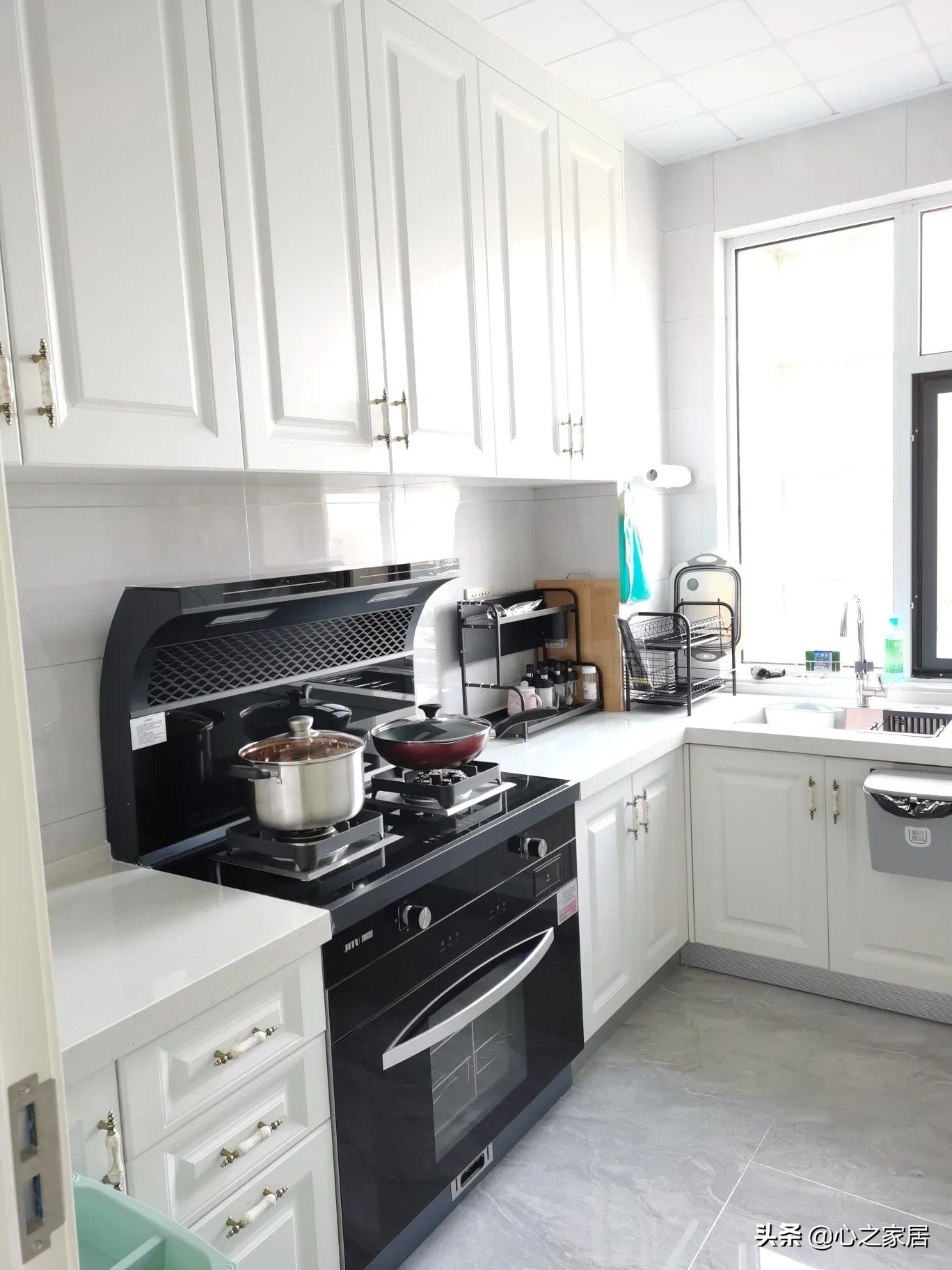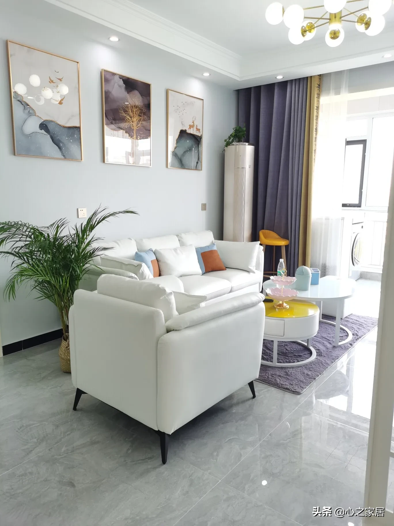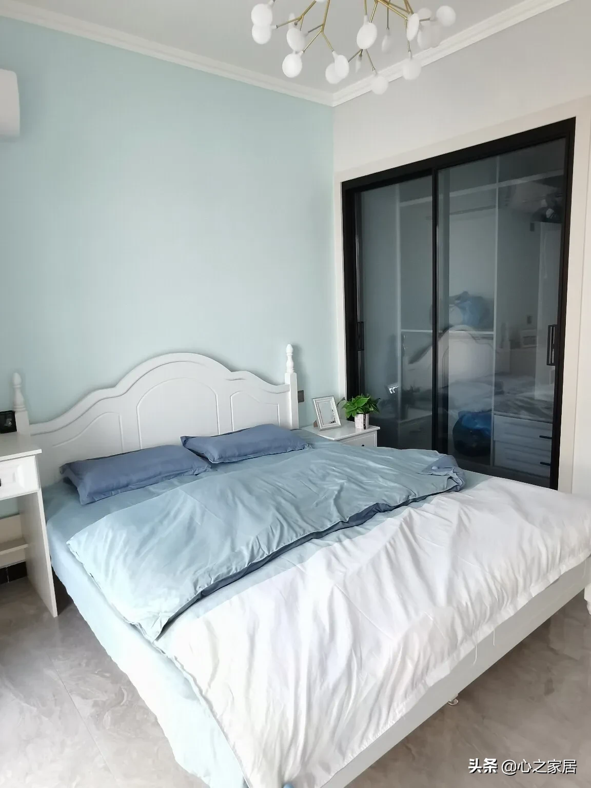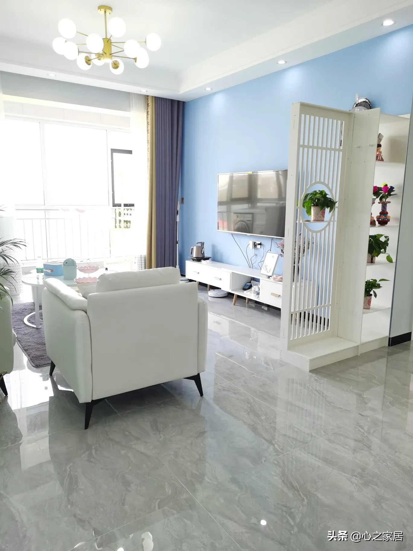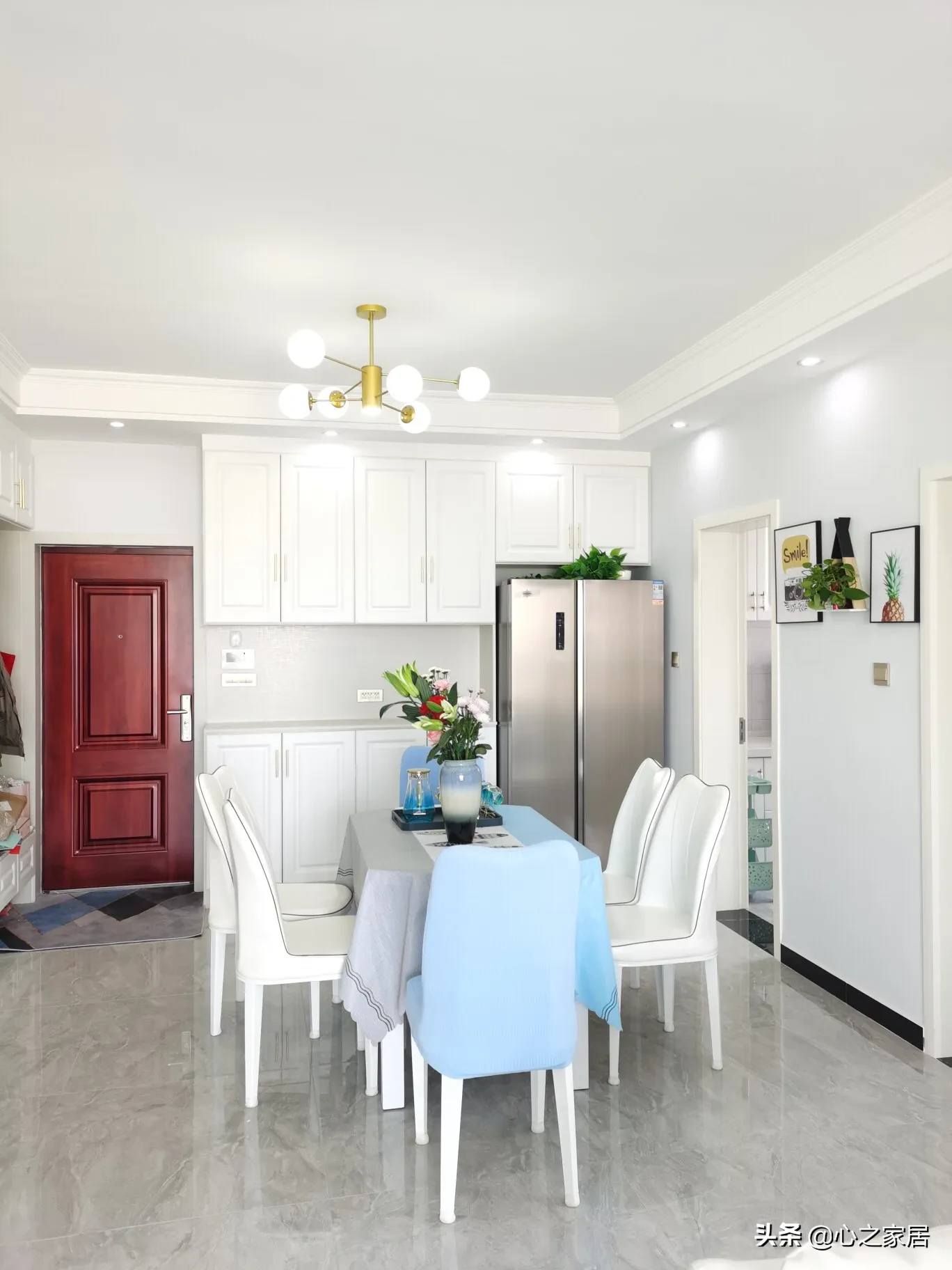 多姿多彩清新时尚的家装设计,家居生活就要如此绚烂缤纷。整个房子给人一种年轻活力满满的感觉,清新自然,入户门两边墙壁分别设计通顶的鞋柜和餐边柜,白色柜体金色把手,台面是石英石的,简约大气方便实用。餐边柜设计了冰箱的空间,正好在厨房门口,也方便实用,厨房门要是拓展一下做成玻璃推拉门就更好了。厨房L型布局,白色橱柜和台面看着干净整洁,吊柜直接做到顶,收纳空间更大。客厅沙发背景墙和电视背景墙分别用了青色和蓝色,颜色都很艳丽,用最简单的方式打造时尚大方的效果,买了一个屏风柜挡在了电视柜旁边,进门正对空间做一下简单的遮挡,想法很对,但感觉有点怪怪的,或许放在沙发旁边效果会更好。主卧青绿色的背景墙温馨清爽,入墙式的衣柜做了一个玻璃推拉柜门,时尚大气。