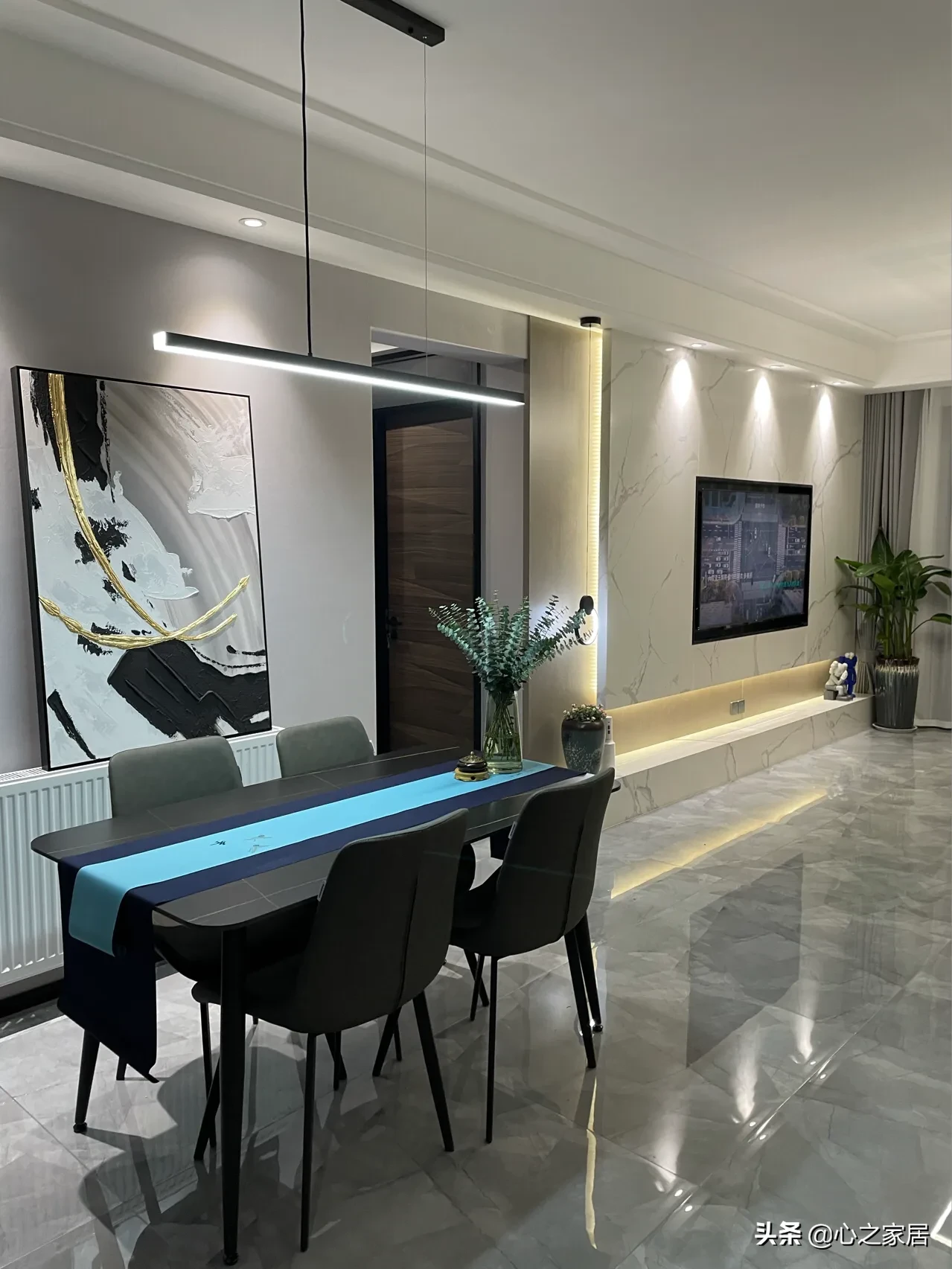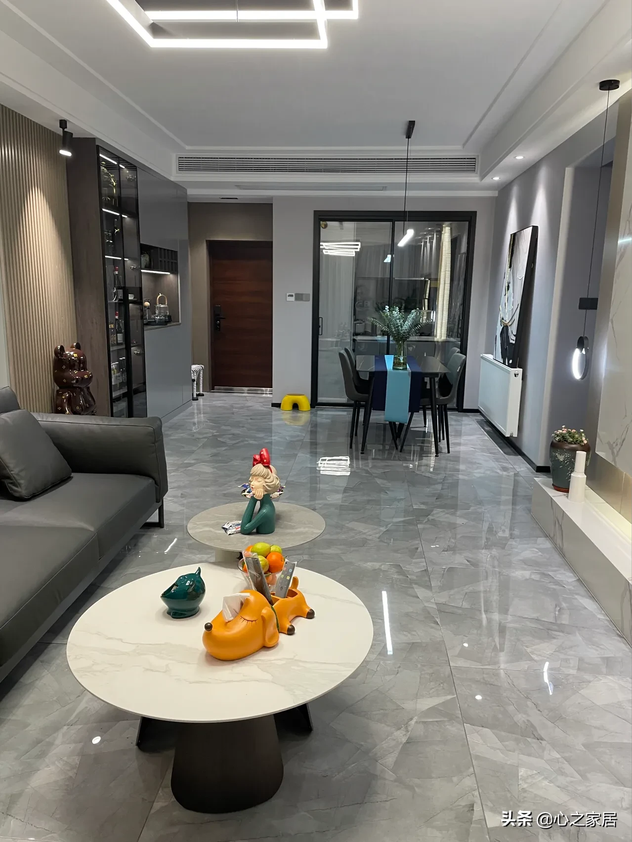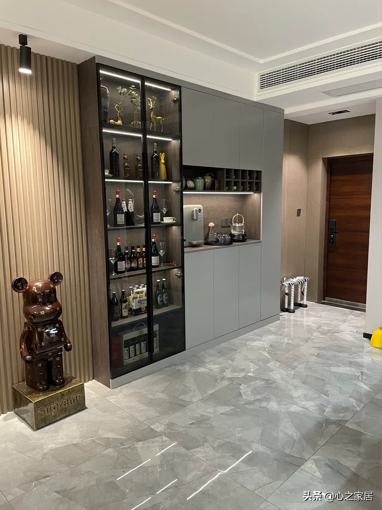 118㎡的房子套内面积90㎡,全屋通铺的深灰色地砖,没有过门石,全屋定制的柜子也都是灰色柜门,基本都是平板柜门,看着光洁明亮,时尚美观,餐厅旁边的空间太窄,只能把餐边柜酒柜设计在玄关旁边,进门看着也挺气派的,特别玻璃柜门酒柜,里面安装了灯带,摆满各种酒水的时候感觉有酒吧的味道。