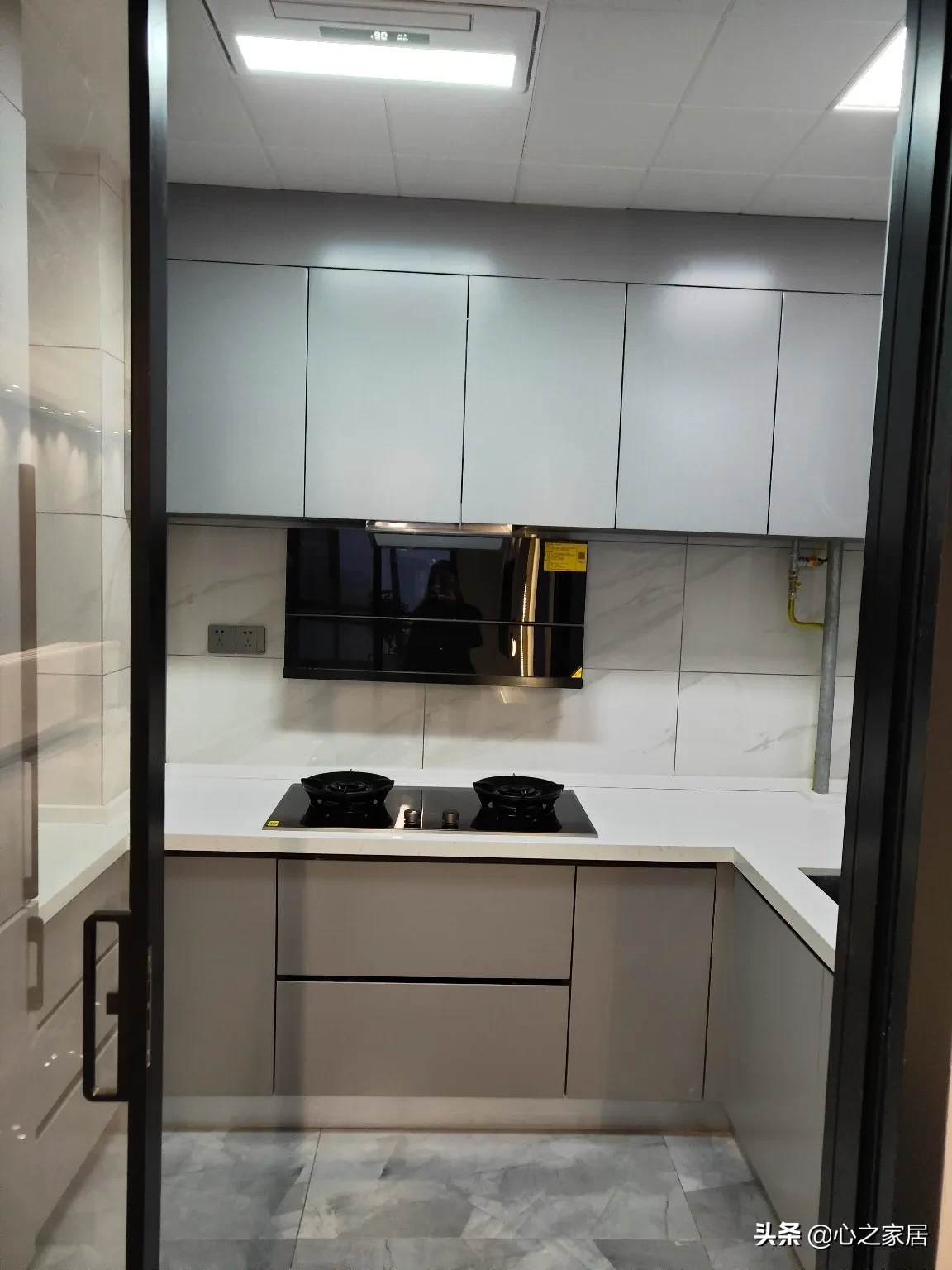 厨房U型布局,不是很大的厨房定制的橱柜和吊柜,隐形把手和反弹器的设计让整体完整性更强。冰箱也是完全融入橱柜当中的,完全看不出来。