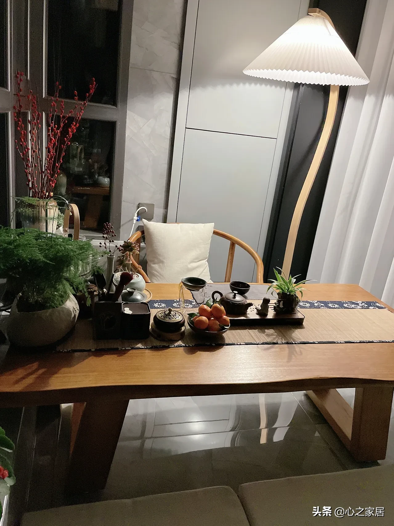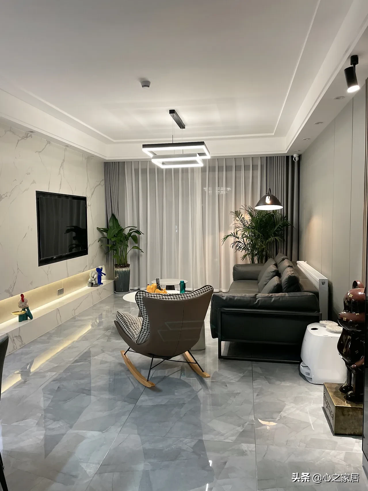 电视背景墙做了护墙板➕大理石悬空的设计,很气派豪华。沙发背景墙直接护墙板,简单大方,阳台设计了一个入墙式的阳台柜,柜子不大,放置了茶座,旁边就是落地窗,品茶赏景放松心情。