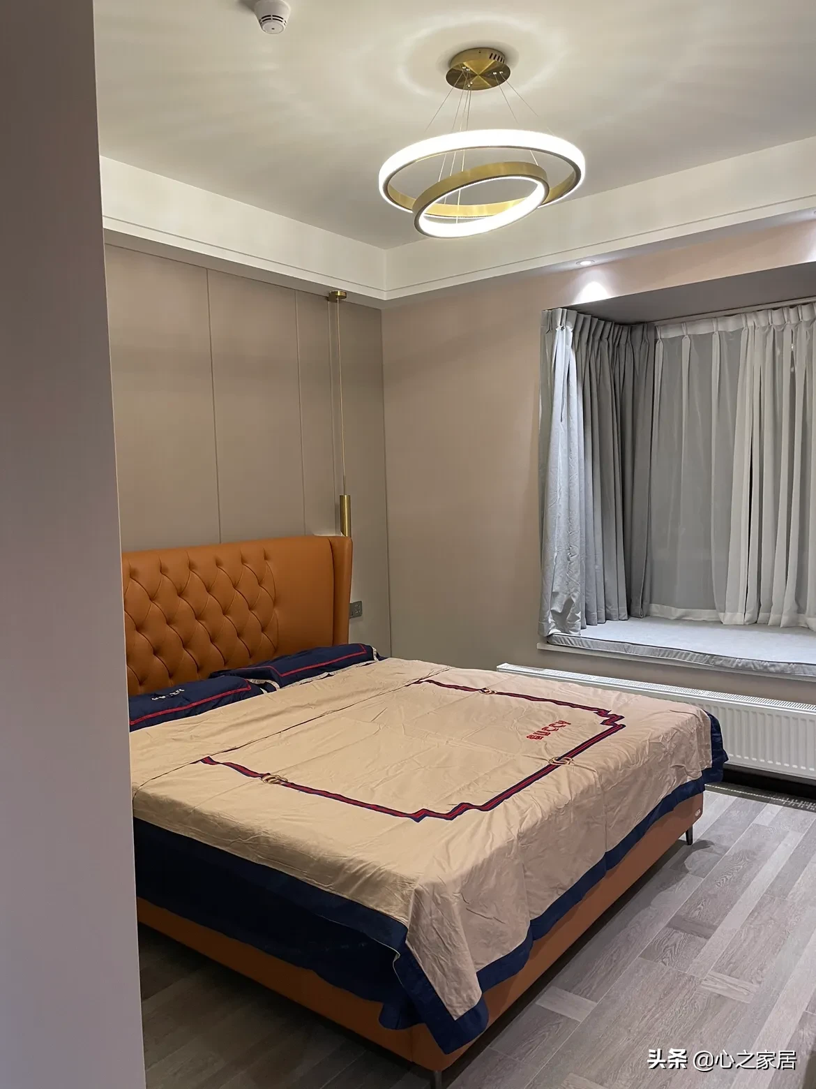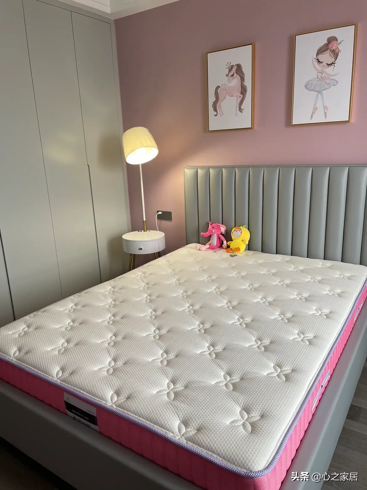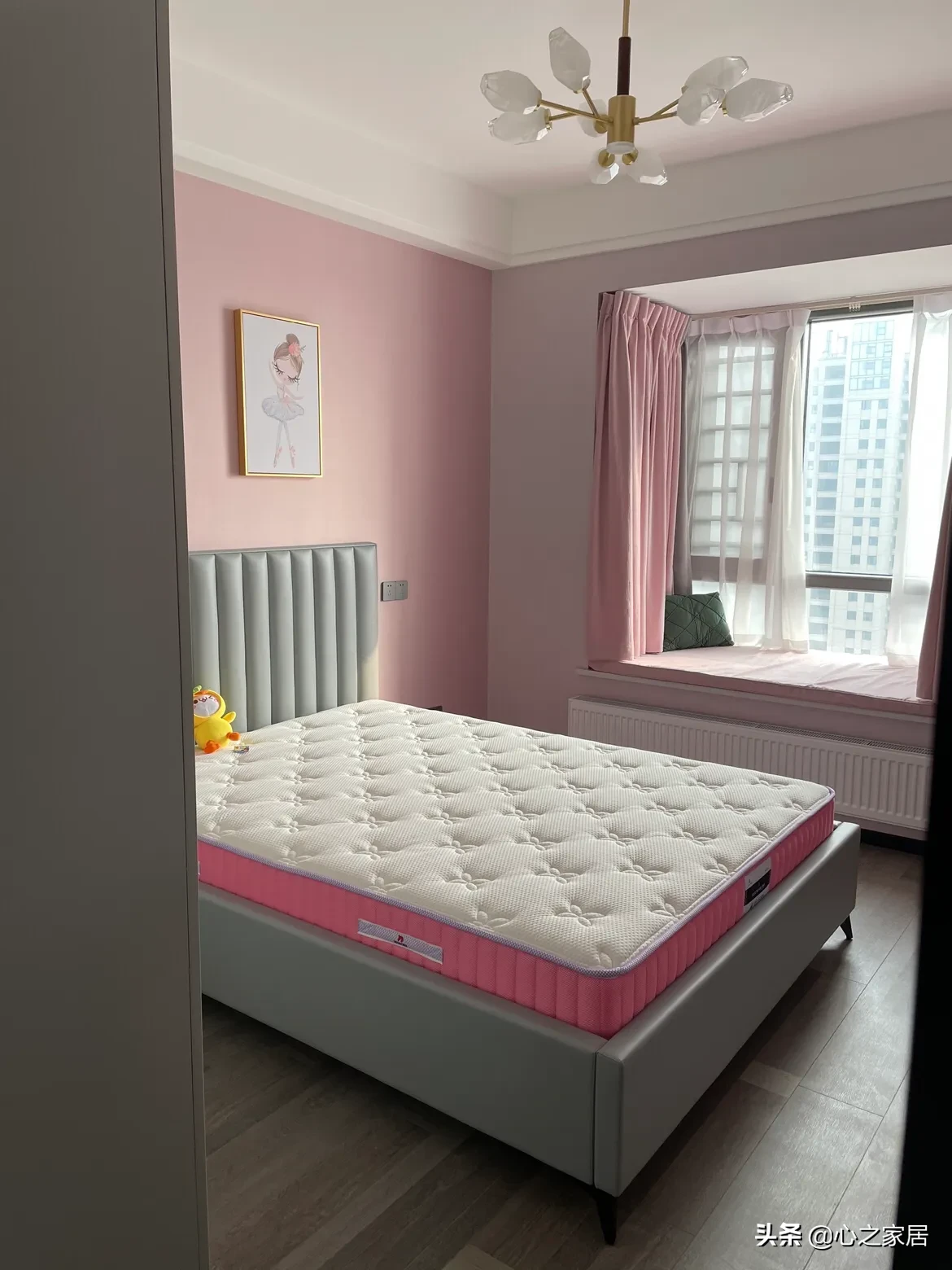 主次卧都有飘窗,空间都显得很宽敞,主卧依然深色调性,次卧粉色空间,通顶衣柜都是柜门直接到顶的设计,简约大气。