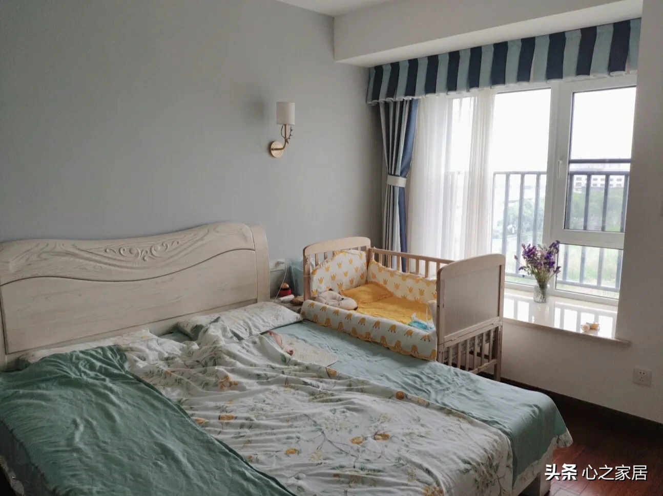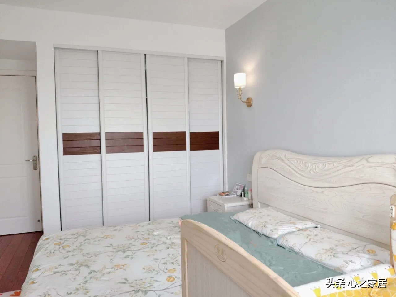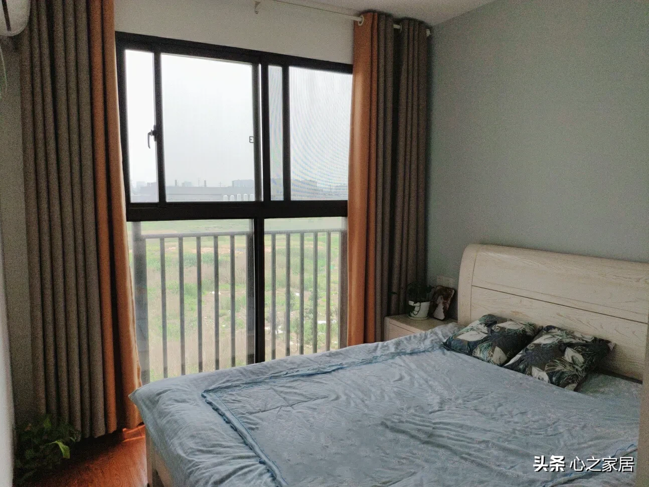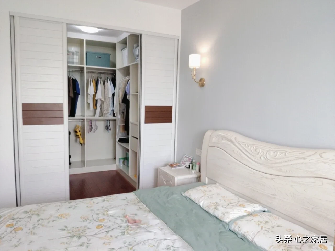 主卧拥有飘窗,空间宽敞明亮,步入式的衣柜做了四开的推拉门,不过两边的柜门是固定的,衣柜里U型布局,收纳空间宽敞实用,对于想要衣帽间却没有那么多空间的房子来说,这样的设计可以弥补一下。次卧做了落地窗的设计,房间小用落地窗让房间显得宽敞一些。#家居#
