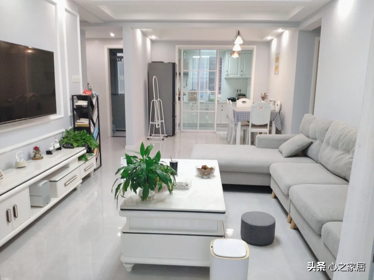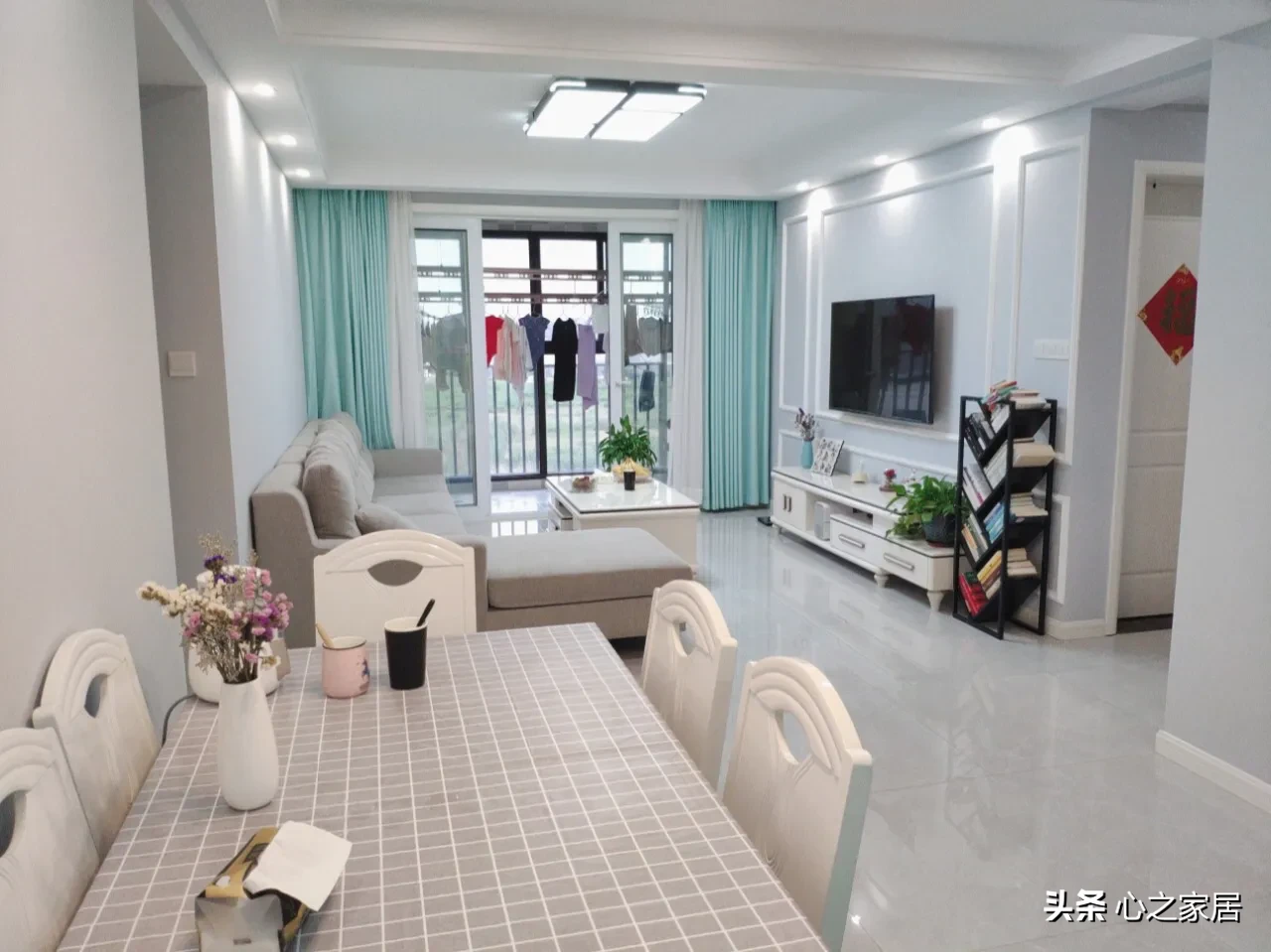 100㎡的房子选择最普通的家装风格,打造舒适温馨的新家,预算有限只能简单设计简单装修,但最终呈现出来的效果还是很满意的,整个房子显得宽敞明亮,整洁温馨,全屋统一刷的雾霾蓝的乳胶漆,颜色偏浅更显时尚清新,电视背景做了石膏线,简约大气美观时尚,阳台断桥铝落地窗,采光通风都很好,阳台和客厅之间做了四开的推拉门,窄门的效果更显精致美观。茶几和电视柜是一整套的,岩板台面,光滑细腻结实耐磨。餐厅没有做餐边柜,太贵也没那么大空间,紧挨厨房,需要什么直接就去厨房拿,感觉餐边柜也没有什么用处,这样简单的家装风格也不适合搭配什么酒柜,所以一切从简了,直接放上冰箱和餐桌椅就OK了。