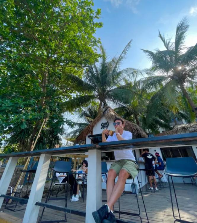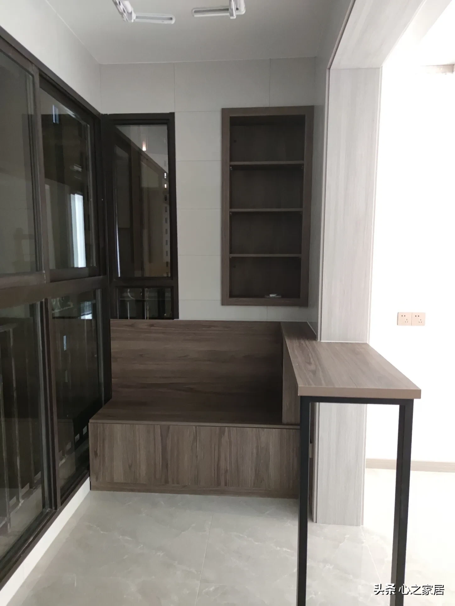 客厅简单的乳胶漆墙壁,没有做太多装饰,小空间做的太复杂感觉会很乱,沙发也没有选择转角款,多留出一些空间能显得宽敞一些。阳台落地窗采光充足,一边设计了洗衣机柜,洗衣机和烘干机叠加放置,节省空间,两机中间有隔板,不是直接放上去的。阳台另一边设计了吧台和卡座,墙壁上还有比壁龛,一个非常舒适有情调的放松休闲空间,全屋最精致时尚的地方,白天看看书听听音乐晒晒太阳,夜晚欣赏夜景品品美酒,向往的生活状态。