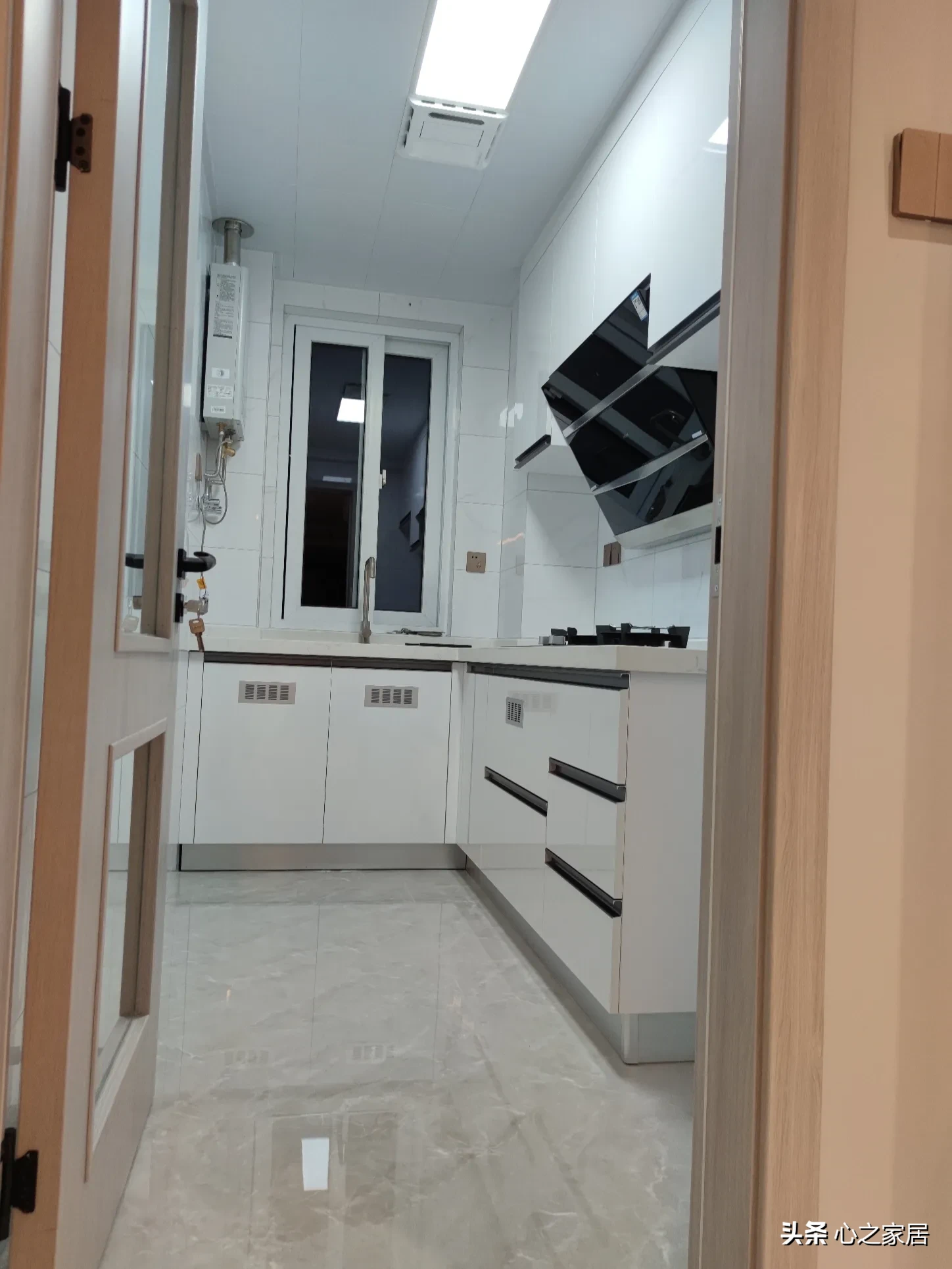 进门就是客餐厅,所以餐边柜和鞋柜属于同一个柜子,银灰色的柜子平板柜门,完整美观,中间和下面都有灯带,很有烘托气氛的效果,最里面做了一个到顶的玻璃柜门的酒柜,提升家居品味。厨房的窄门做了镶嵌玻璃的款式,既有通透性,又有实用性,比纯玻璃的门更安全结实。厨房L型布局,橱柜都是光亮的平板柜门,隐形把手,整洁干净时尚安全。