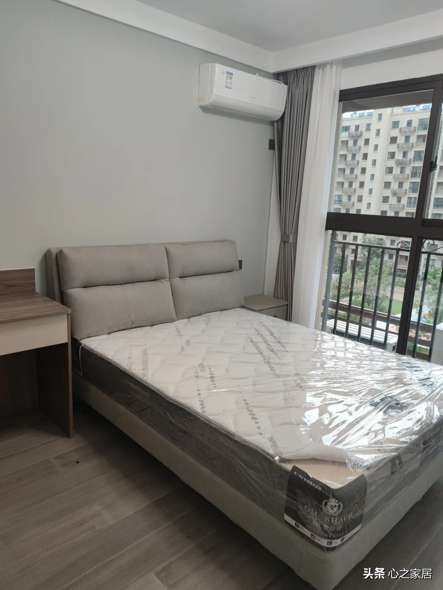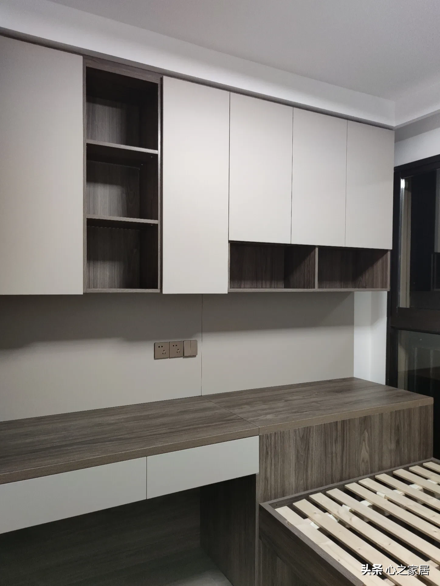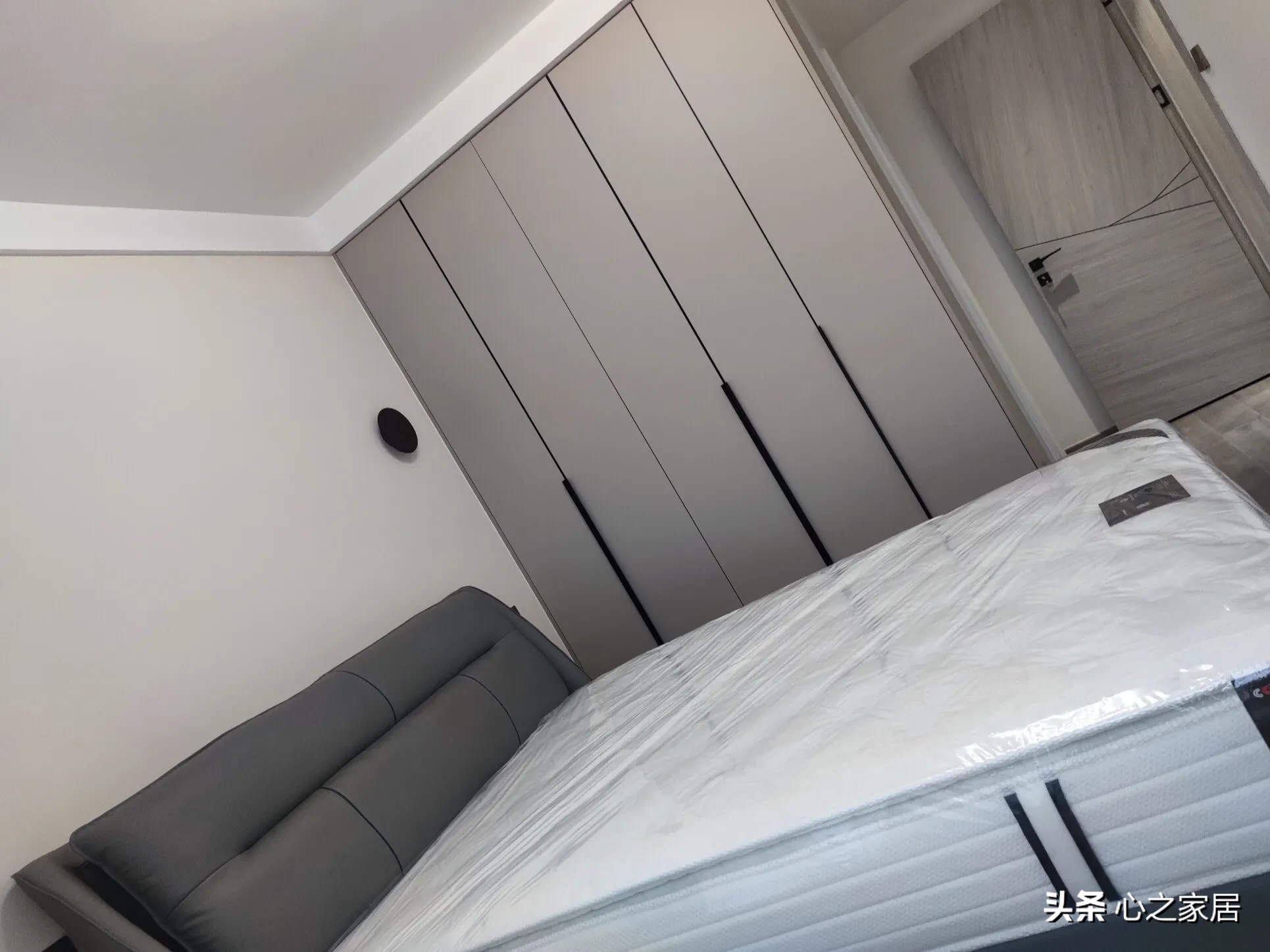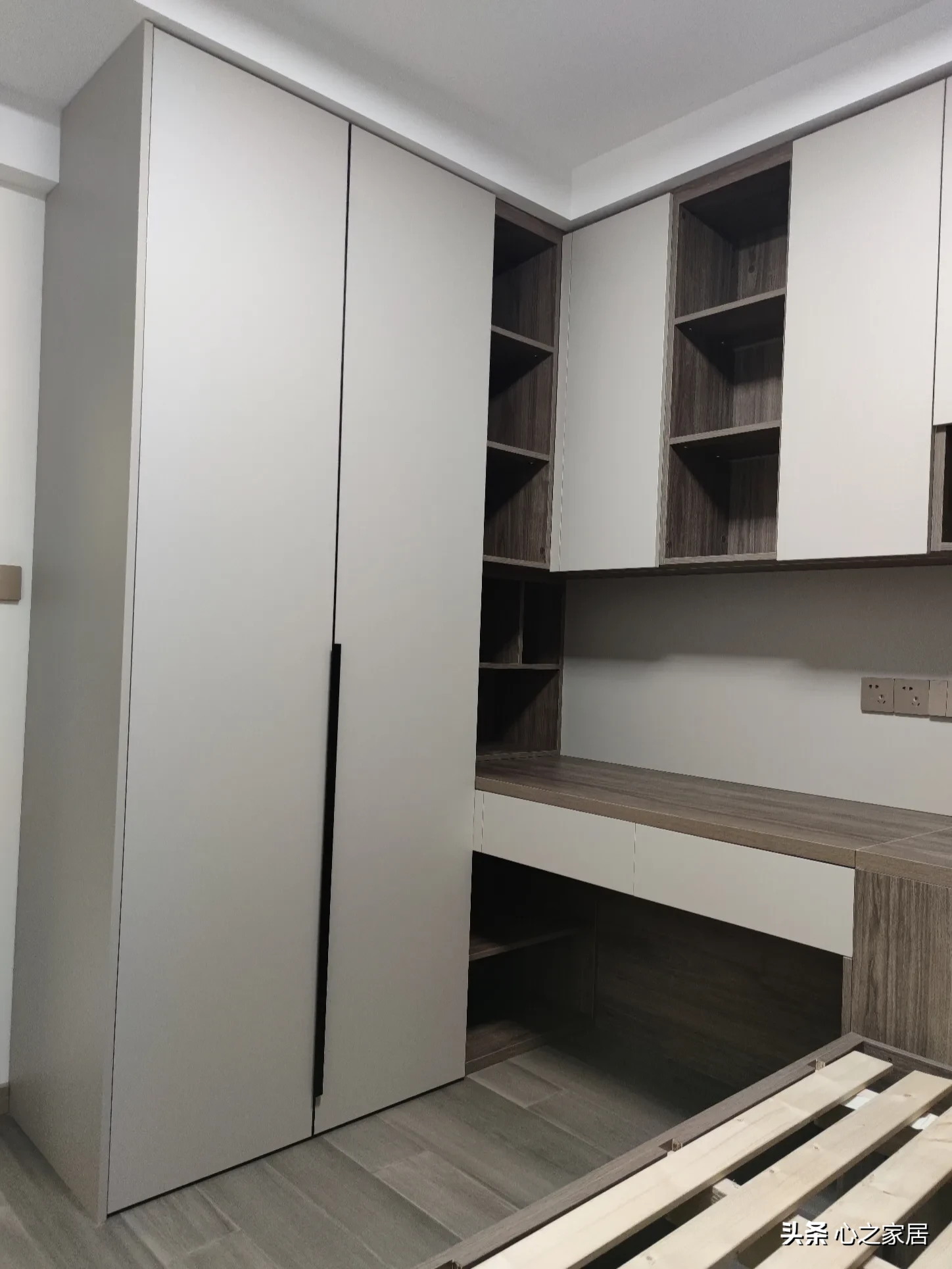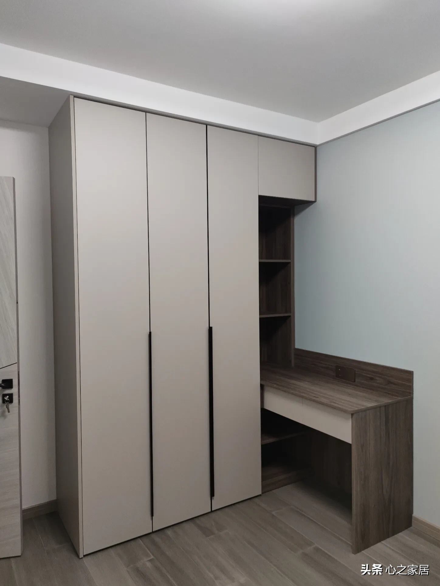 主卧通顶衣柜柜门直接到顶设计,大气时尚,灰色柜门搭配了黑色把手,低调精致。主卧唯一有飘窗的卧室,另一间次卧也是落地窗,对于小户型落地窗真的可以让空间显得宽敞明亮很多,通顶衣柜组合了书桌,更加实用。