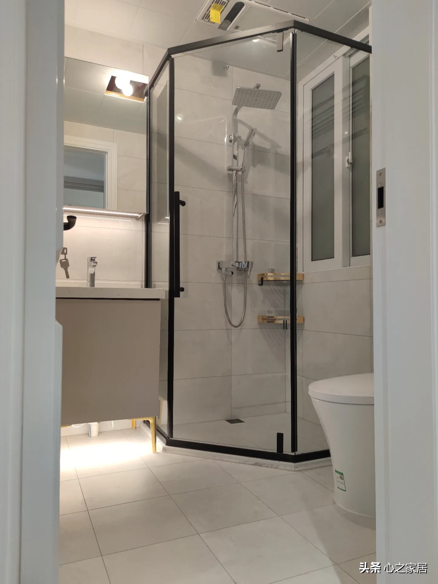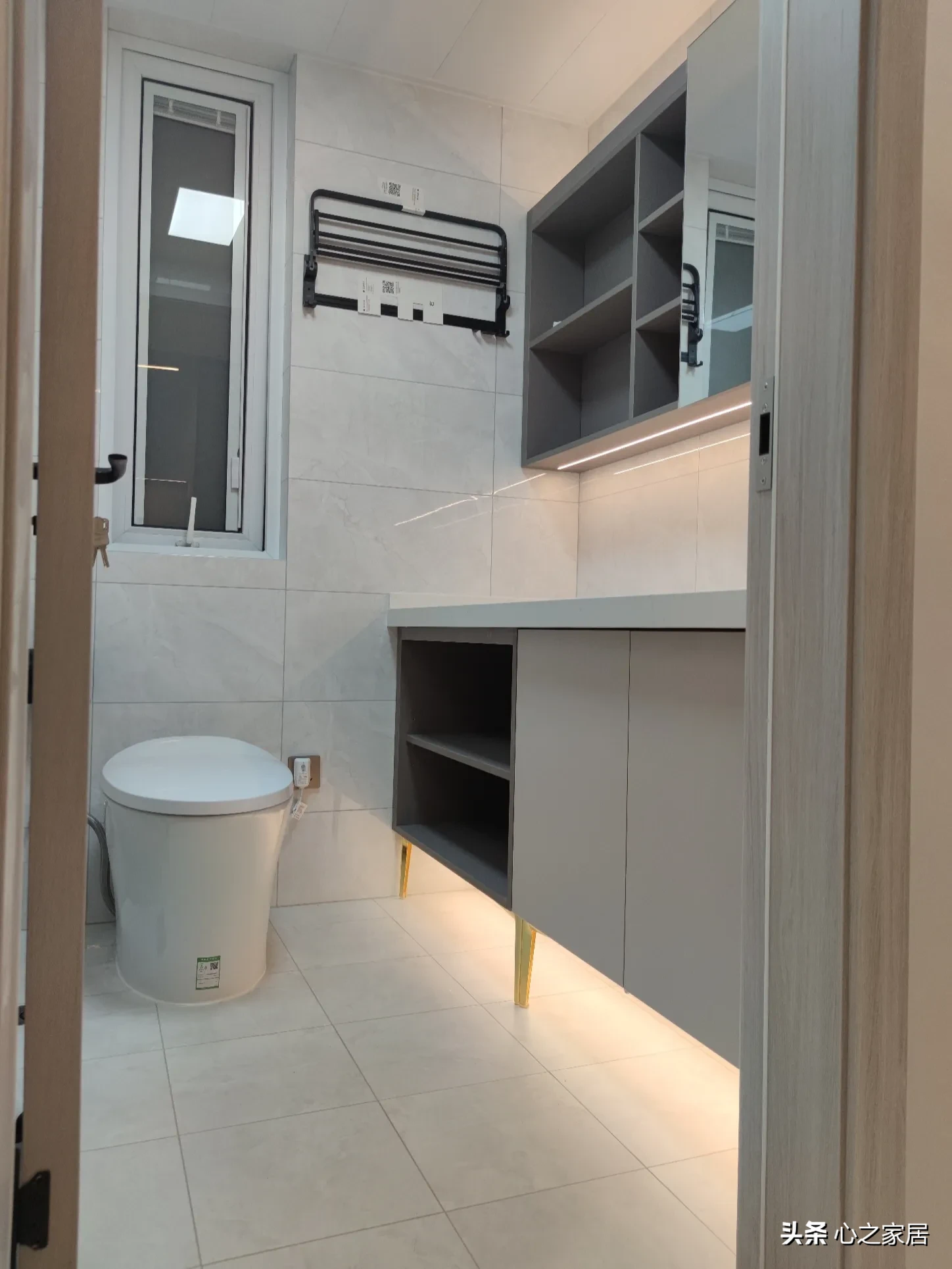 主客卫风格一致,地砖上墙完整统一,浴室柜➕镜柜收纳满足收纳需求,除了镜柜下方安装了灯带,浴室柜最下面也安装了灯带,除了提升情调,也为了以后打扫的时候能够清理的更干净。#Dou爱新居#