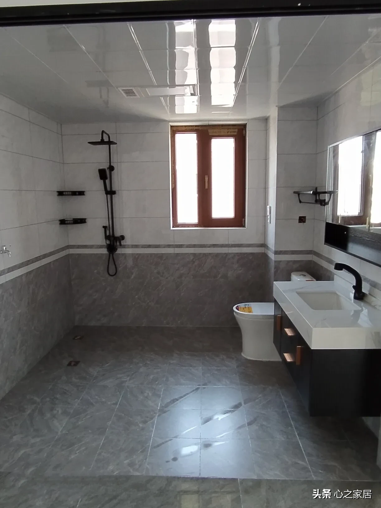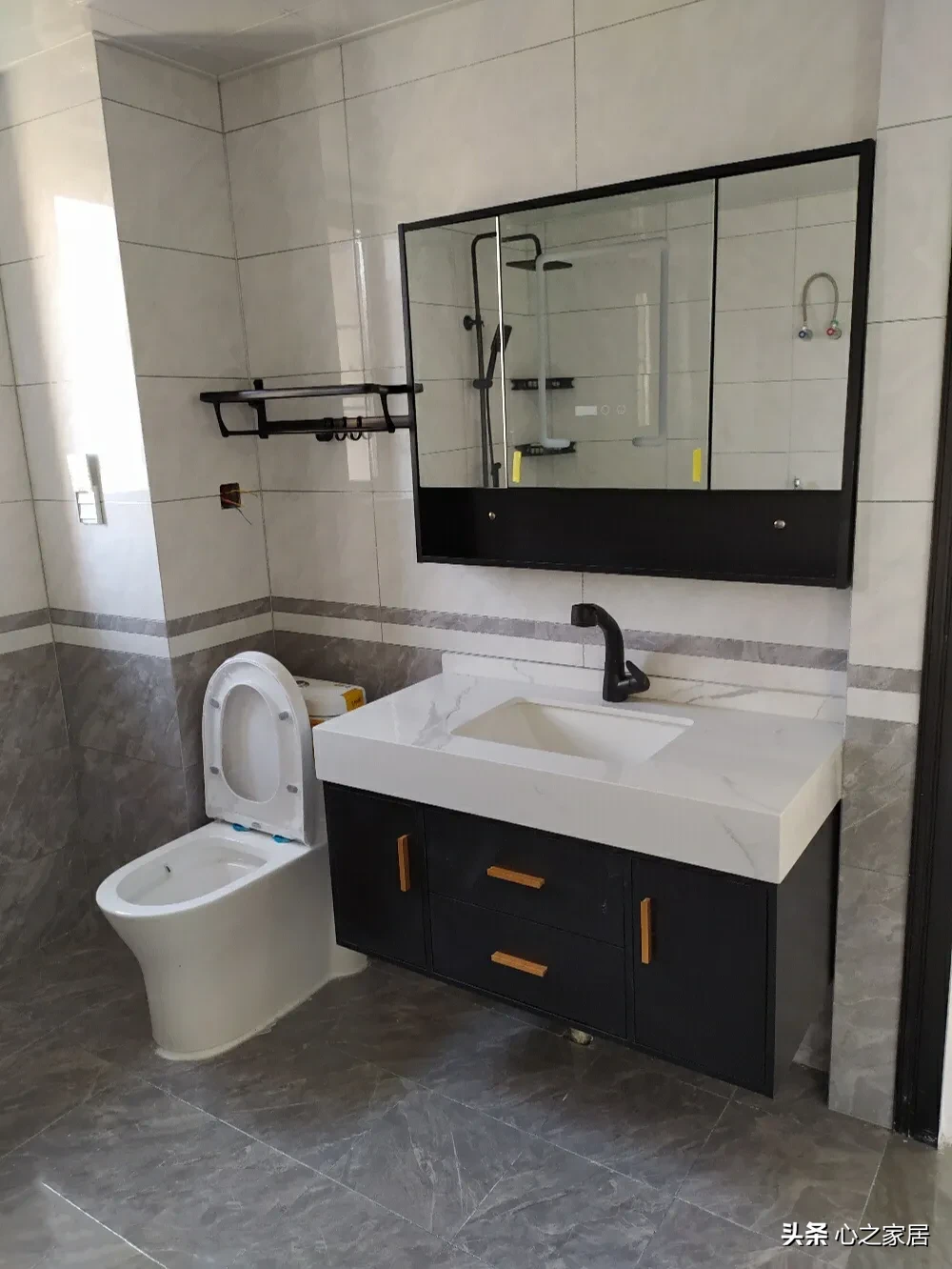 卫生间比较宽敞,为了保持这种宽敞性没有做独立淋浴间,打算用浴帘简单弄一下,浴室柜做了壁挂式的,打扫起来无死角,镜柜满足收纳需求,卫生间做了腰线设计,简单时尚,不显单一。
