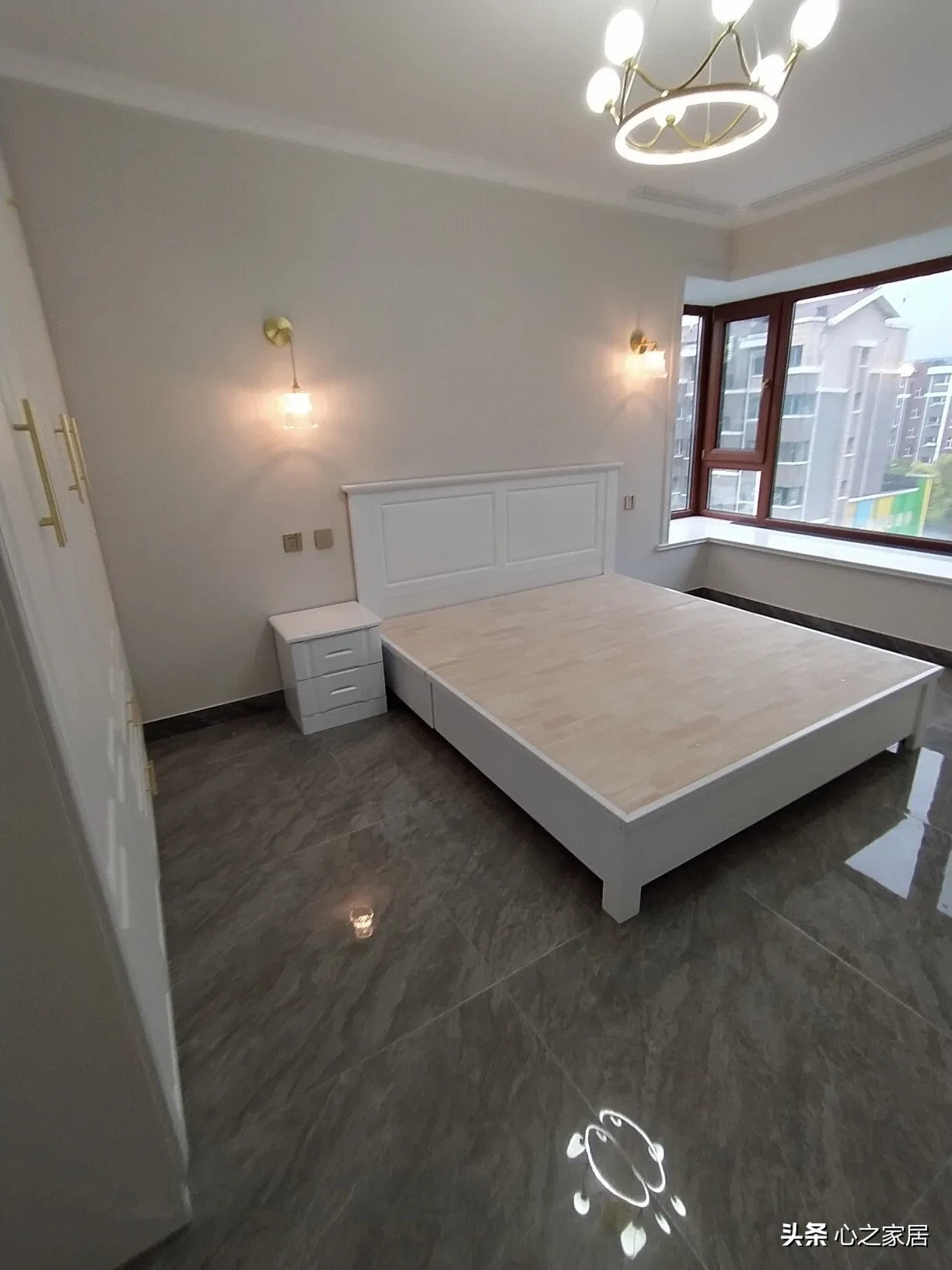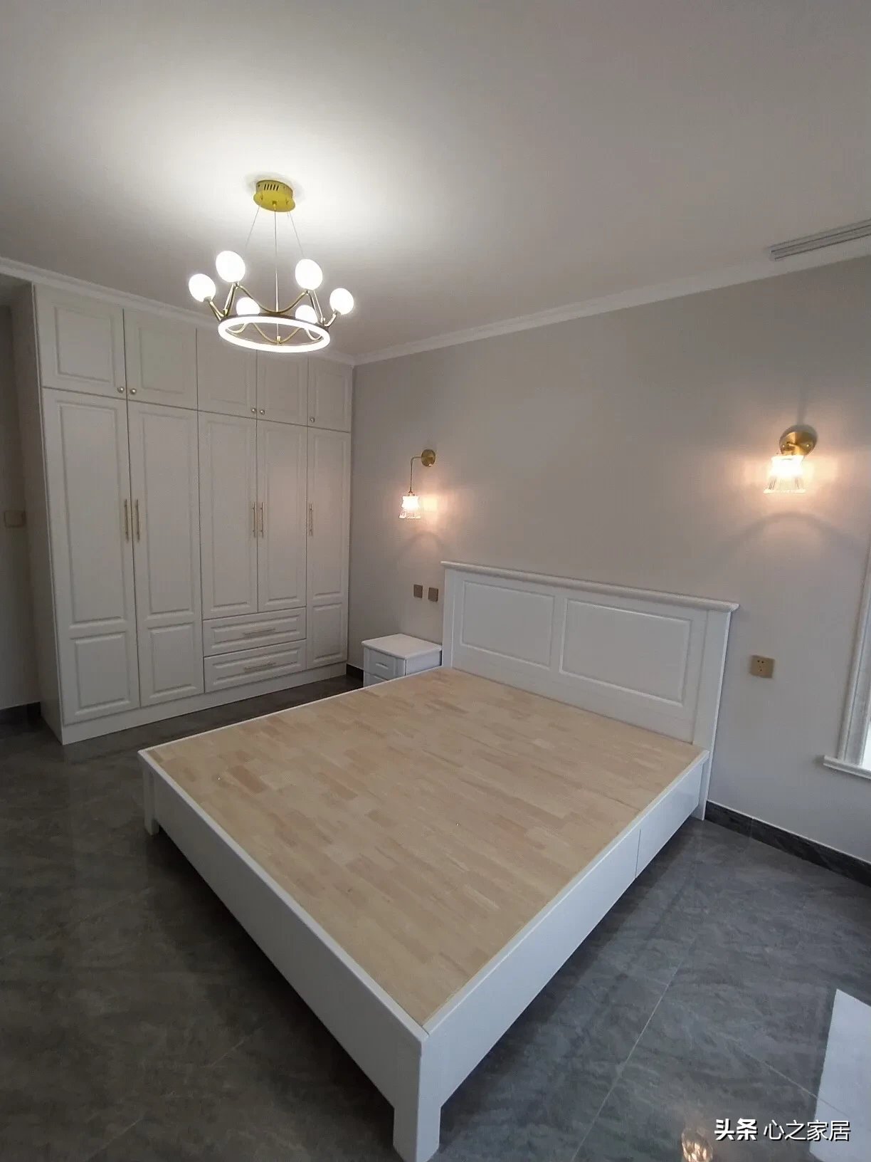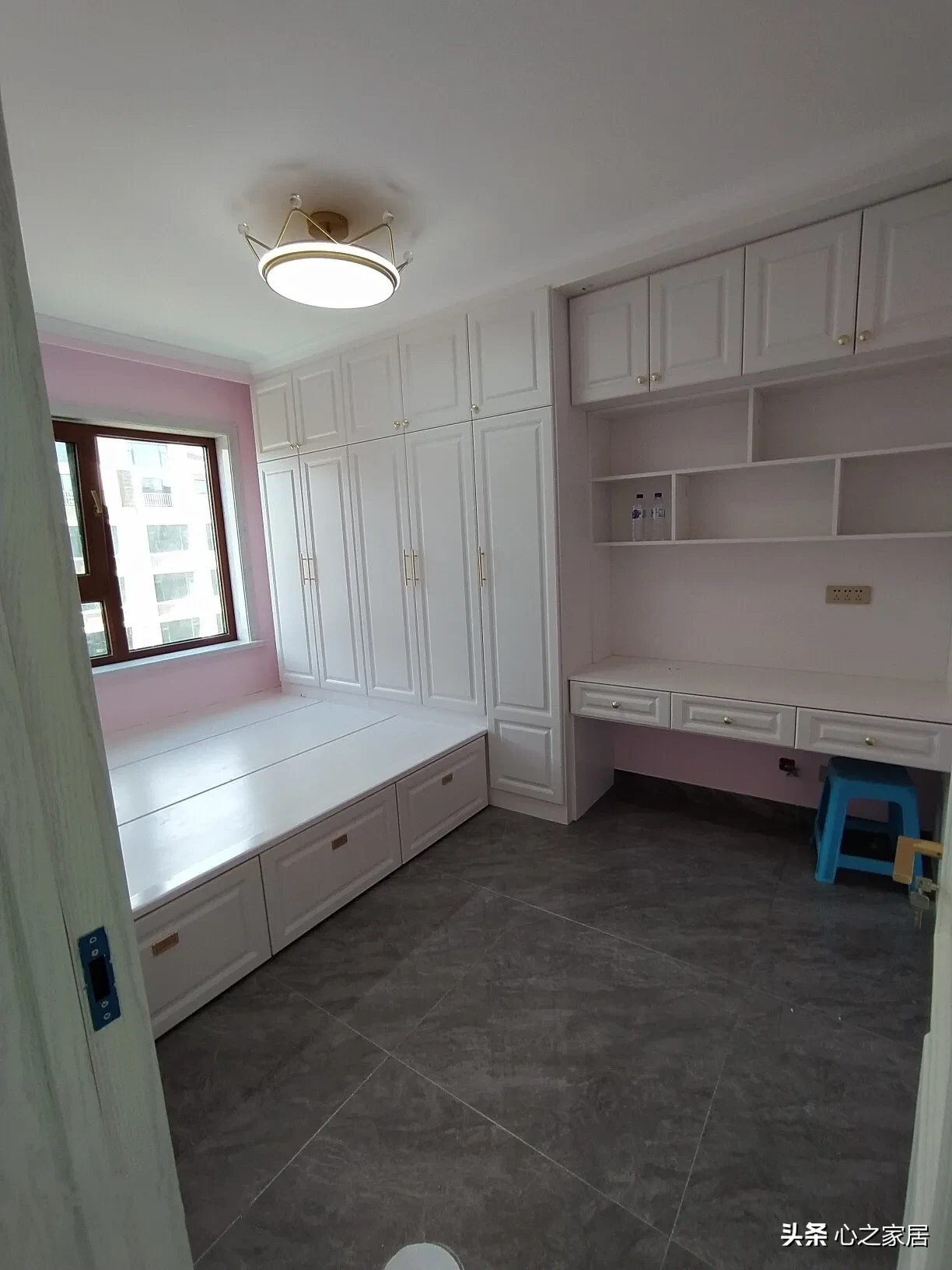 全屋通铺了灰色的地砖,方便省钱,卧室铺地砖也没什么不好的,打扫保养都很方便。感觉太冷就铺个地毯,不过记得要经常清理,地毯最容易积攒细菌。主卧L型的飘窗,更显宽敞明亮,通顶衣柜做了抽屉收纳的设计,简单的实木床结实耐用。另一间卧室选择了榻榻米组合,目的也是为了满足收纳需求,为了给孩子营造温馨浪漫的氛围,墙壁选择了粉色乳胶漆。