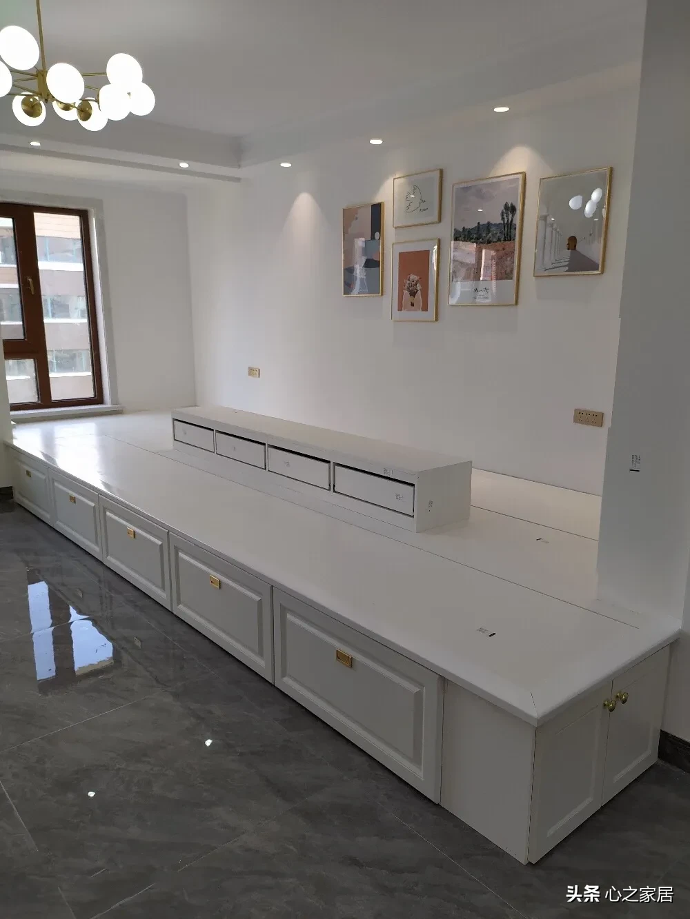 客厅整体设计比较简单,电视背景墙做的简单的石膏线背景墙,简约大气,墙壁都是大白色,干净整洁,无阳台客厅直接把榻榻米做到窗户边,显得特别宽大,墙边还设计了收纳柜,榻榻米上面放置的是电视柜,还没来得及摆放好,客厅放弃沙发改成东北大炕,这样的设计少见,但绝对实用,孩子在客厅玩耍更舒适放心,来个客人也可以直接睡在客厅,对于小户型这样的设计很合适。