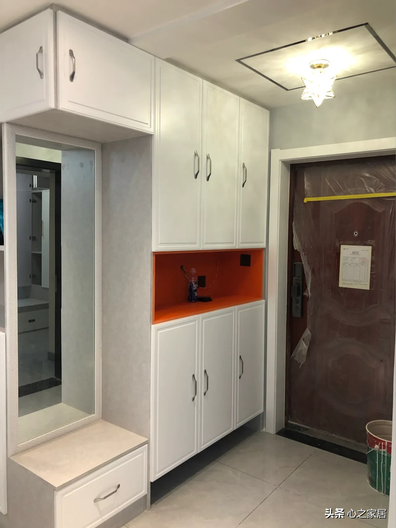 玄关柜和餐边柜连体设计,灰色柜体白色柜门的搭配,简洁干净,为了不那么单调,拼接了橘色的收纳空间,点缀之余提升整体的魅力。玄关柜设计了换鞋凳和穿衣镜,穿衣镜上面的柜子做了一个假柜门,确保整体效果能够更完整美观。