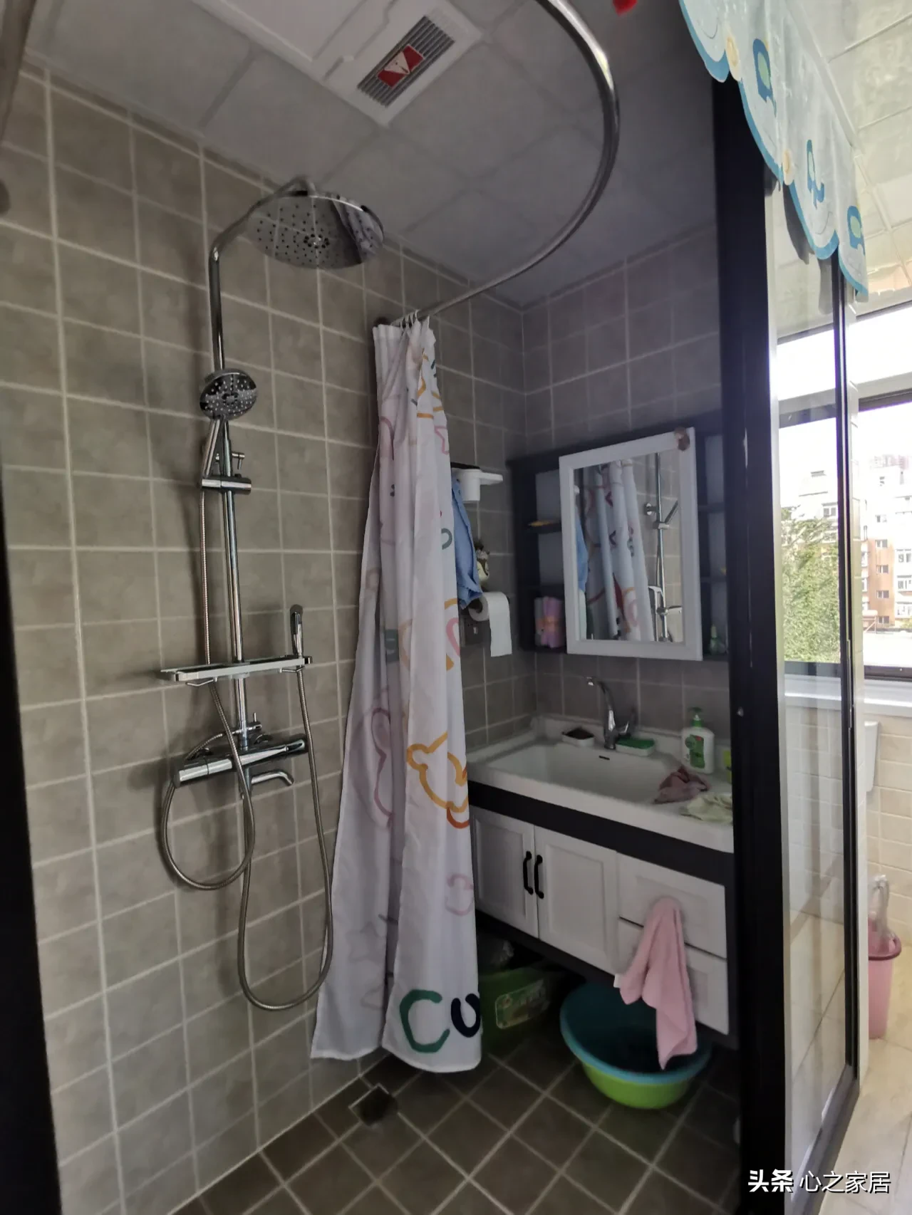 卫生间属于比较另类的格局,和厨房平行,做了推拉门,用浴帘做了简单的干湿分离,壁挂式的浴室柜搭配镜柜,收纳和使用效果更好,这样的小卫生间一定要用壁挂式浴室柜,较少地面的水长期侵蚀浴室柜。