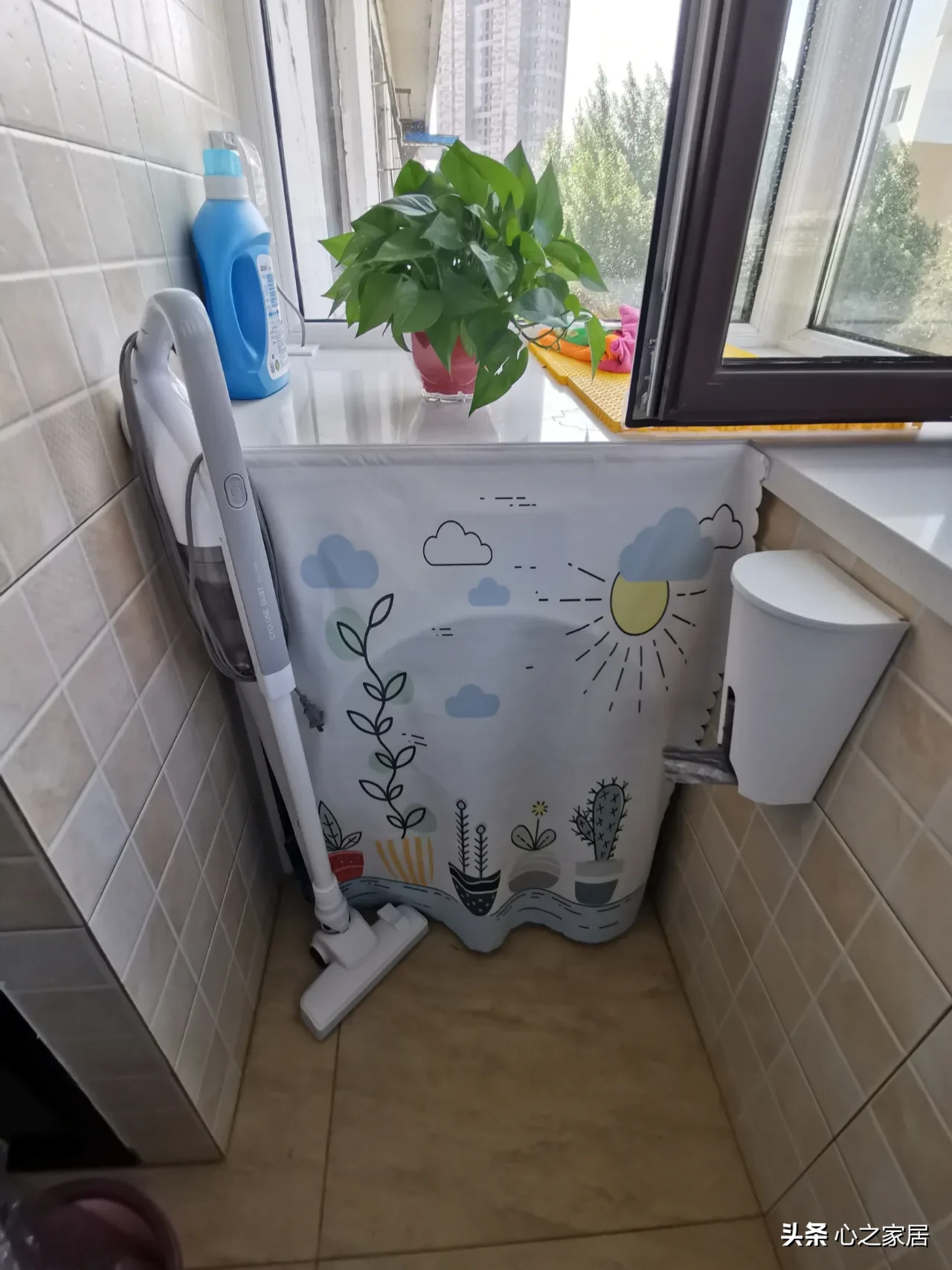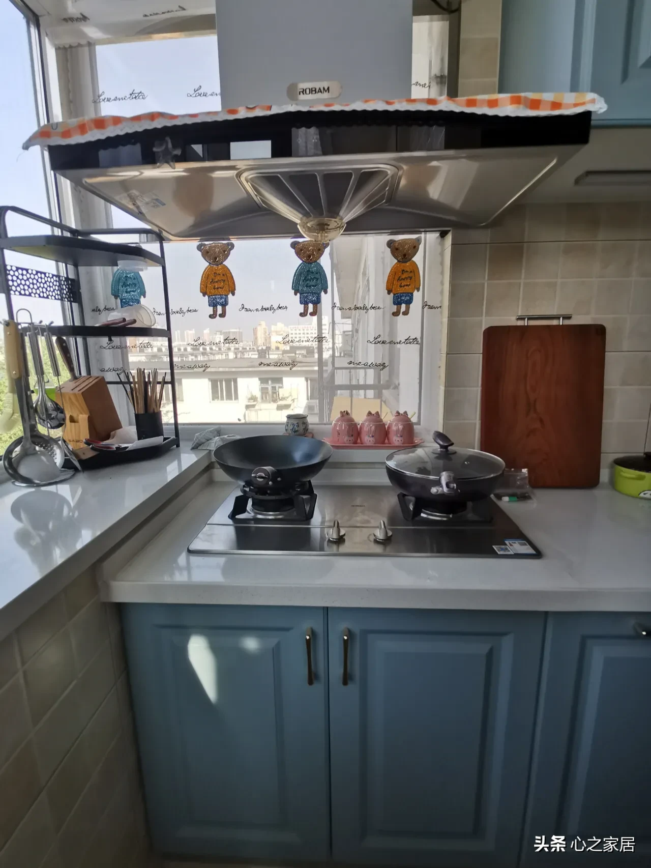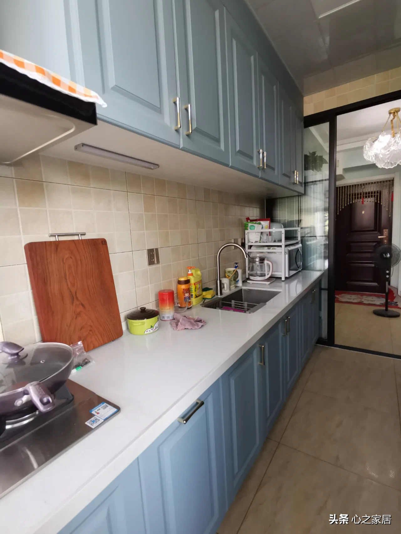 餐桌靠墙角摆放节省空间,需要时摆在中间,冰箱放在厨房门口,遮挡不经常使用的那一半厨房门,窄边玻璃推拉门做的地轨,稍微高出了一块,有点不方便。橱柜做了一字型布局,吊柜也一直做到窗户边,排油烟机靠窗户放置,让油烟尽量远离房子的其他区域。橱柜选择了蓝色模压柜门,现代时尚,给老房子带来一些新元素,吊柜下面安装了灯带,晚上切菜时也不怕看不清,厨房虽小但洗切炒动线流畅明确,使用起来还是很方便轻松的。阳台另一边放置了洗衣机,特意设计和窗台找平的石英石台面,洗衣机上面也能方便收纳。