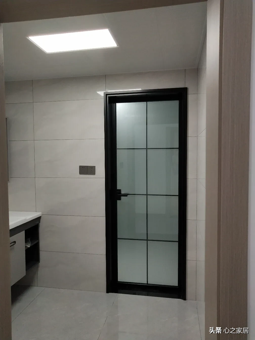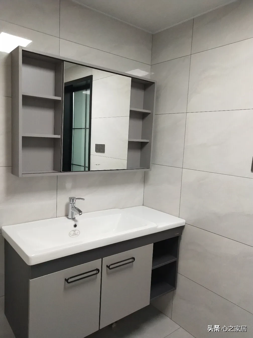 客卫属于双分离,干区和湿区一样,墙壁都贴了瓷砖,更显时尚大气。颜色上选择了灰色为主,浴室柜和镜柜也是灰黑搭配。橱柜选择了瓷砖款式的柜门,无把手设计,完整美观。