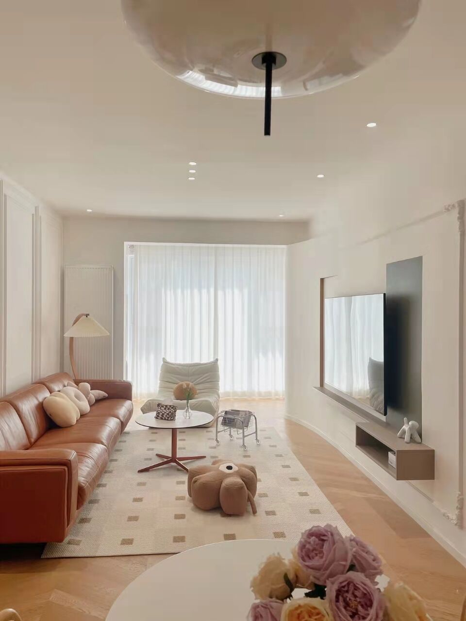 全屋平吊,大概10公分的厚度,搭配无主灯设计。视线就清爽无阻碍,也不会压层高。