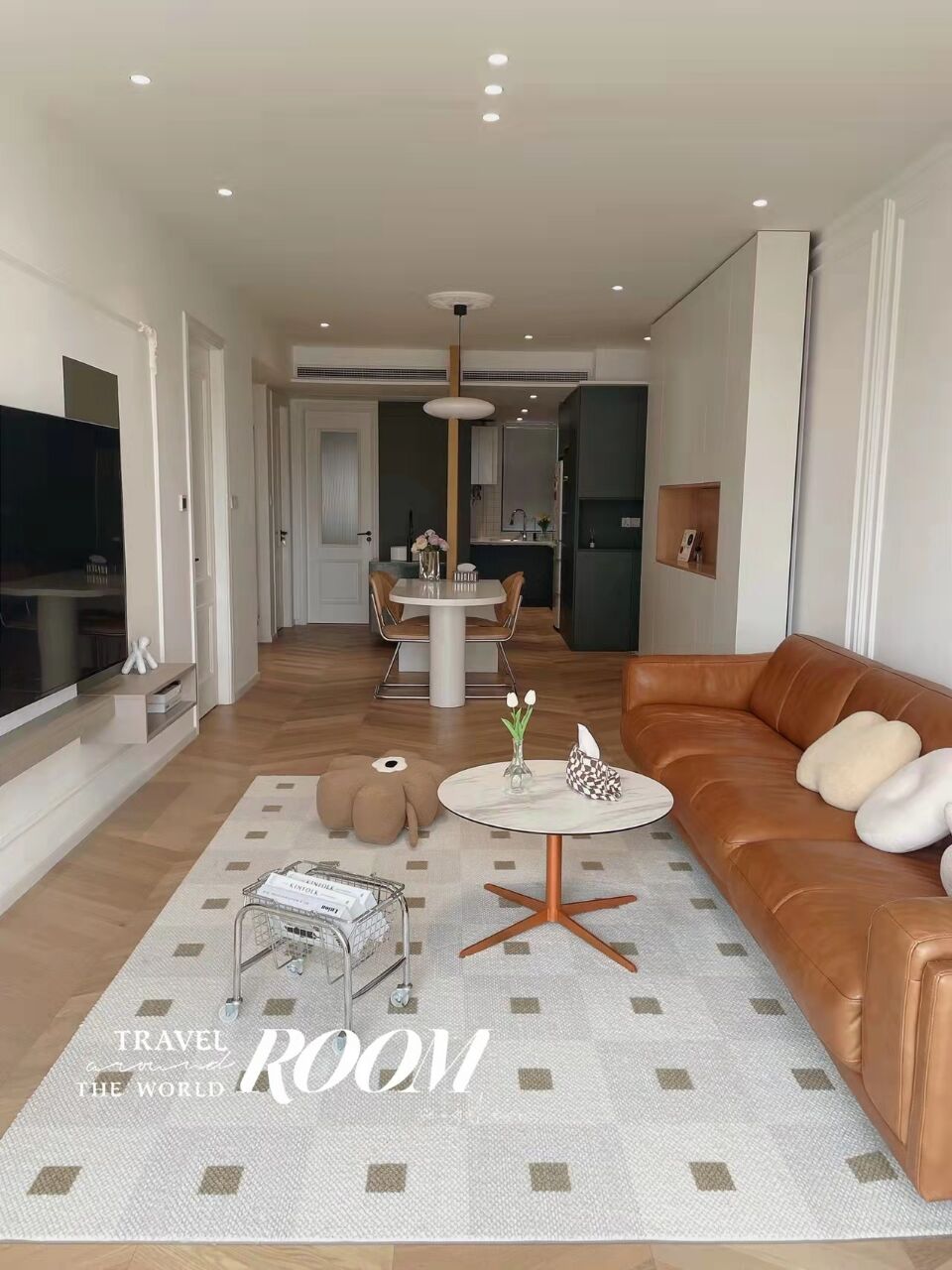 地板选择鱼骨拼,通铺让整个空间更加一体化,延伸感更强,非常适合小户型。