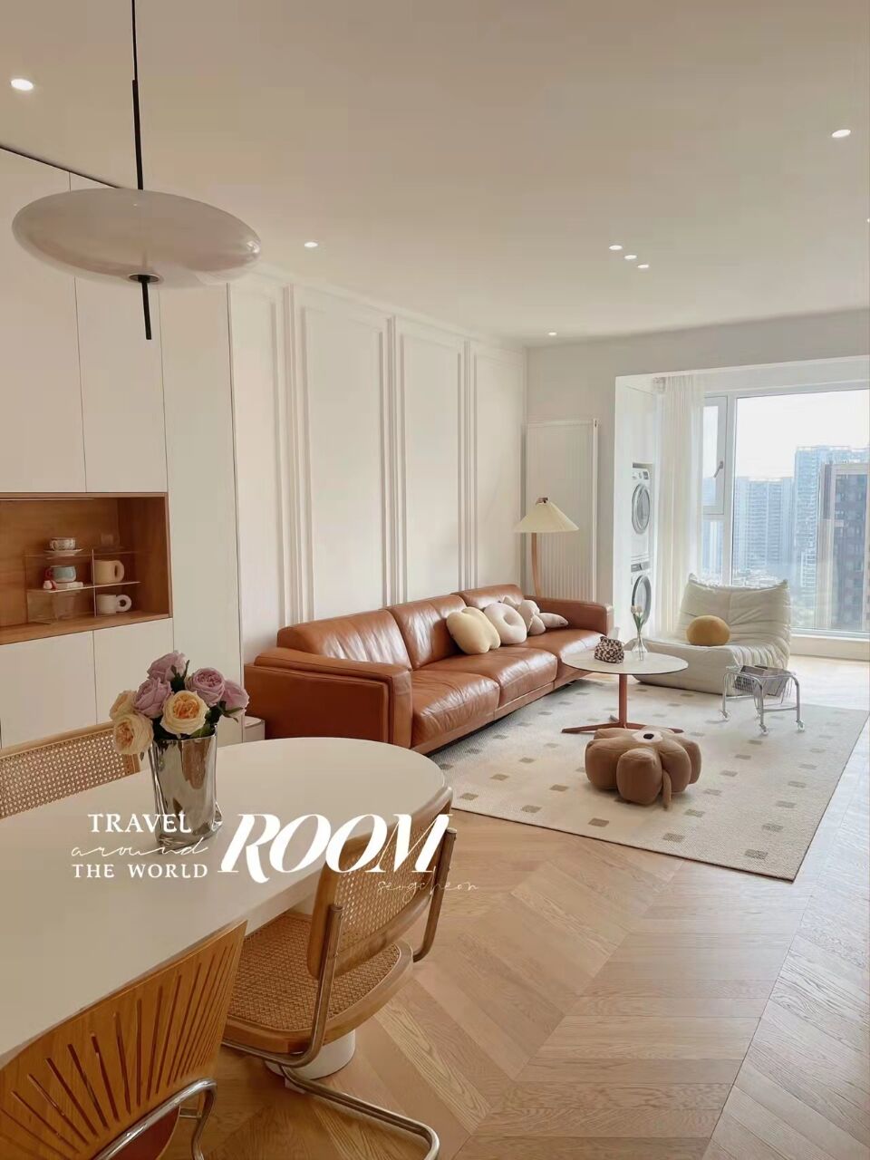 客厅阳台之间的推拉门拆掉,客厅和阳台一体,采光好了,视野也好了不少。平时洗衣服换上烘干机就可以,不影响美观。