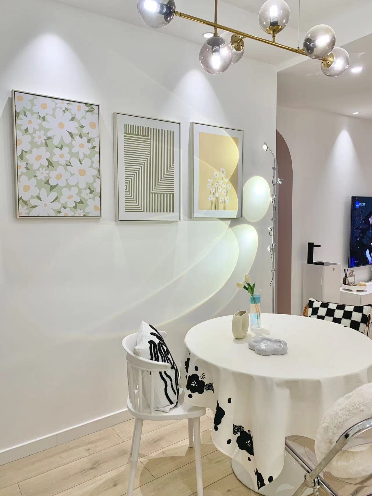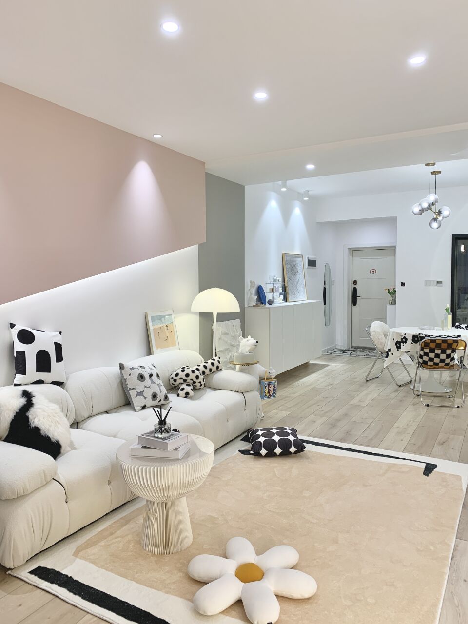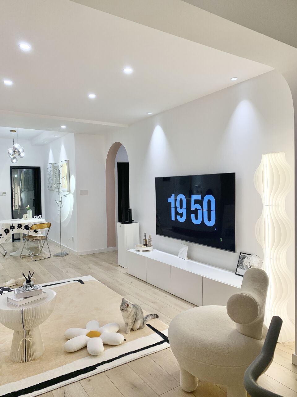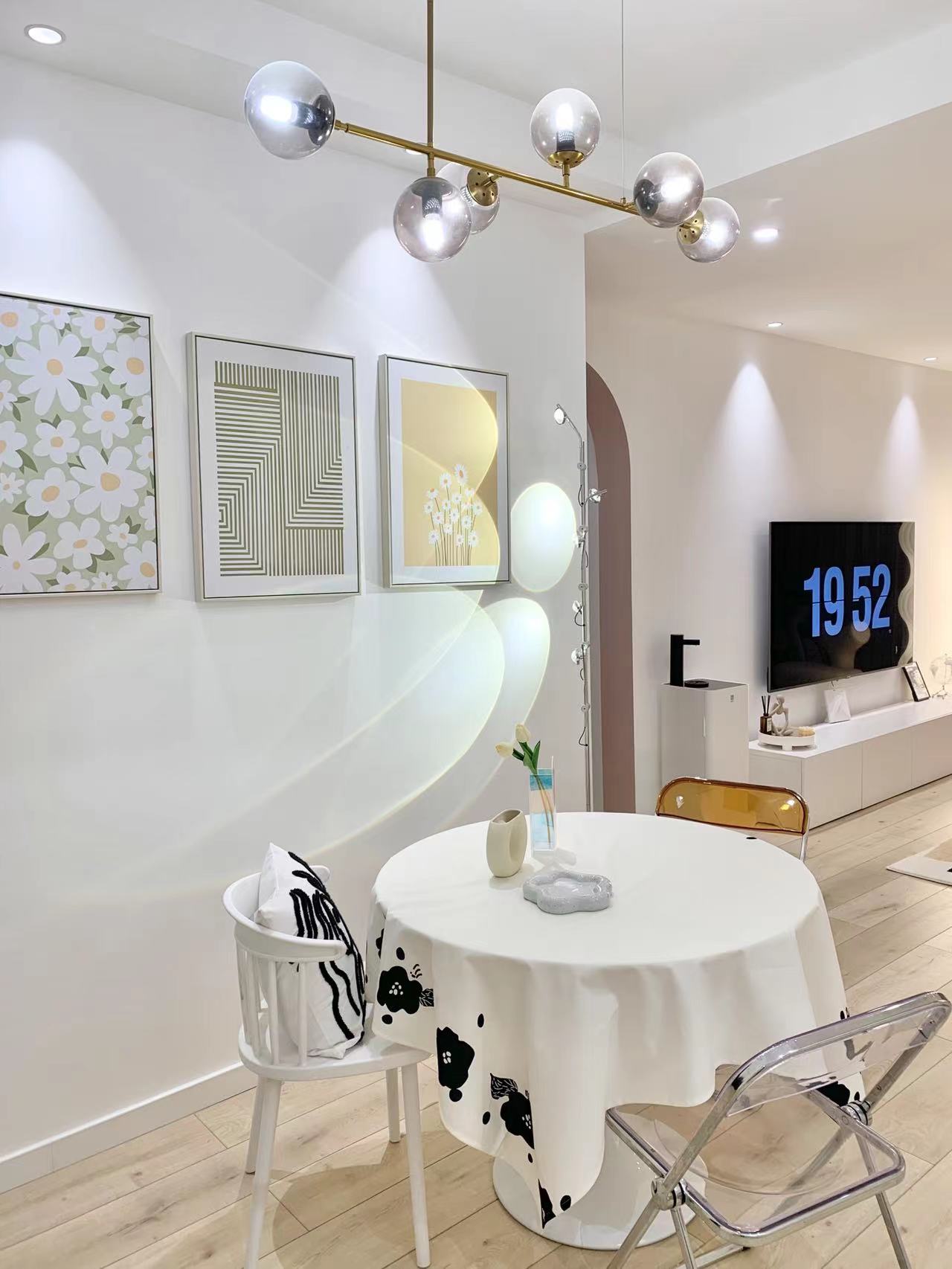 全屋大白墙为主,经典耐看,会让整个空间看着明亮宽敞。后期补漆的话,也不会有色差。无主灯,吊顶下吊9公分。