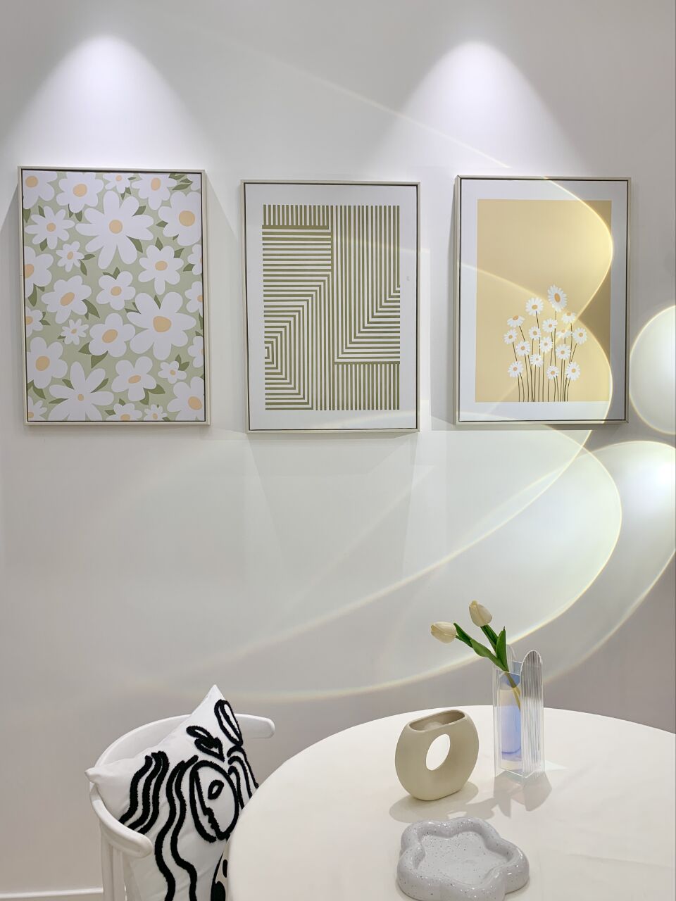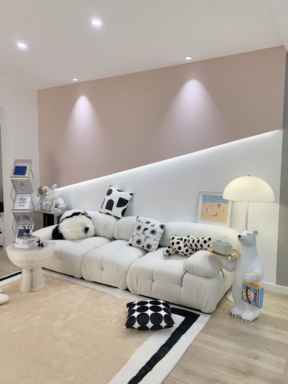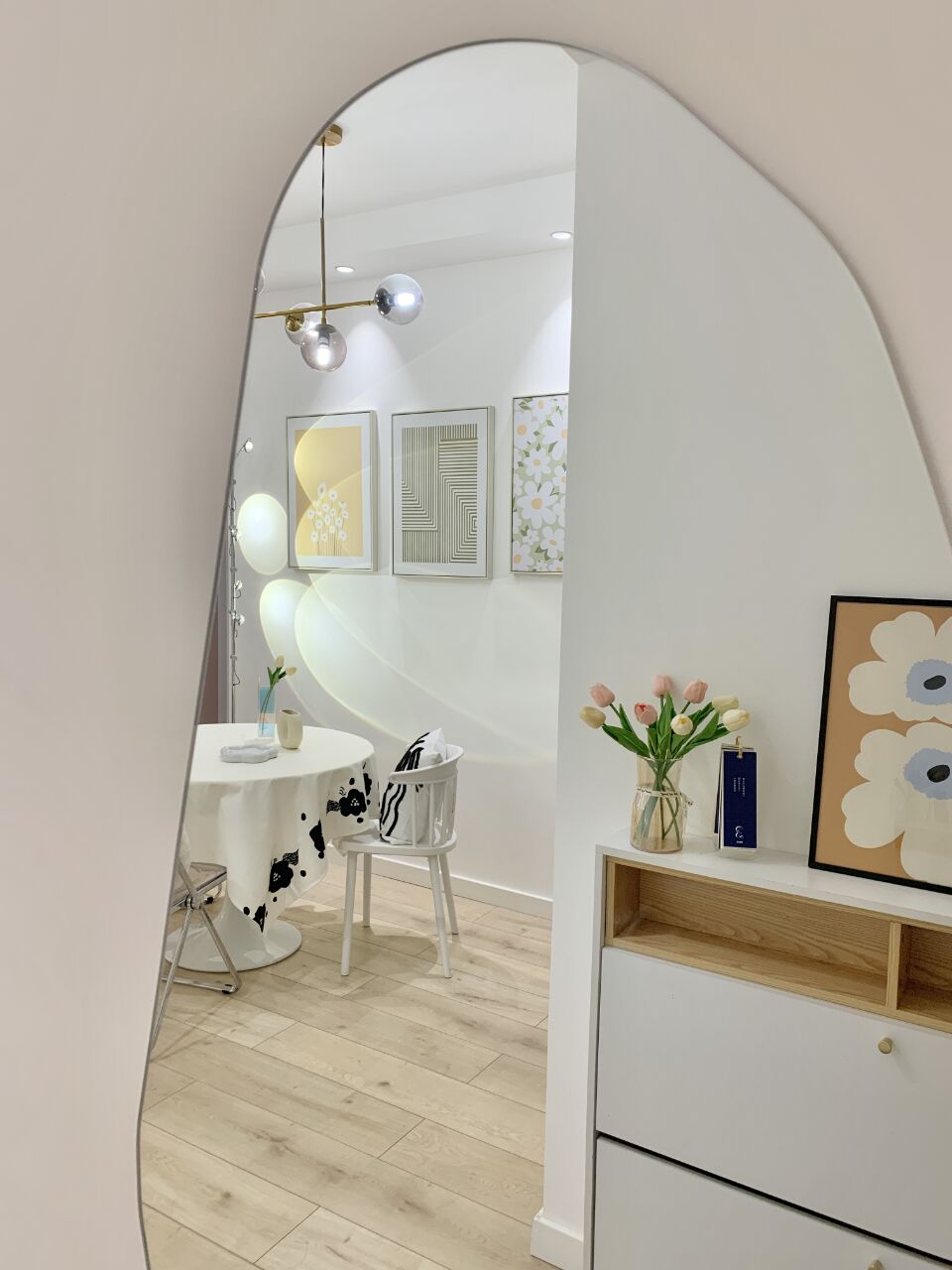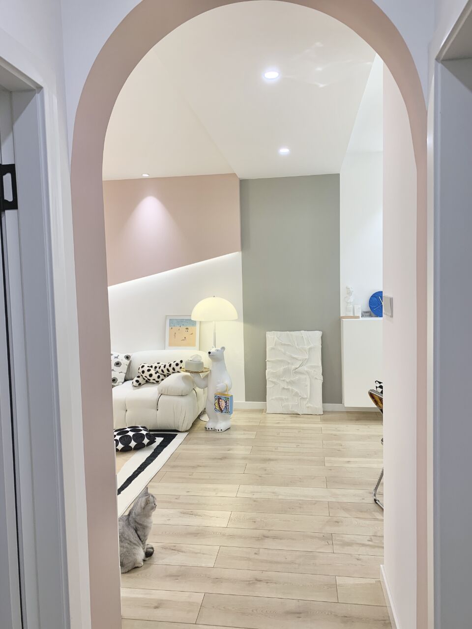 全屋大白墙为主,经典耐看,会让整个空间看着明亮宽敞。后期补漆的话,也不会有色差。无主灯,吊顶下吊9公分。