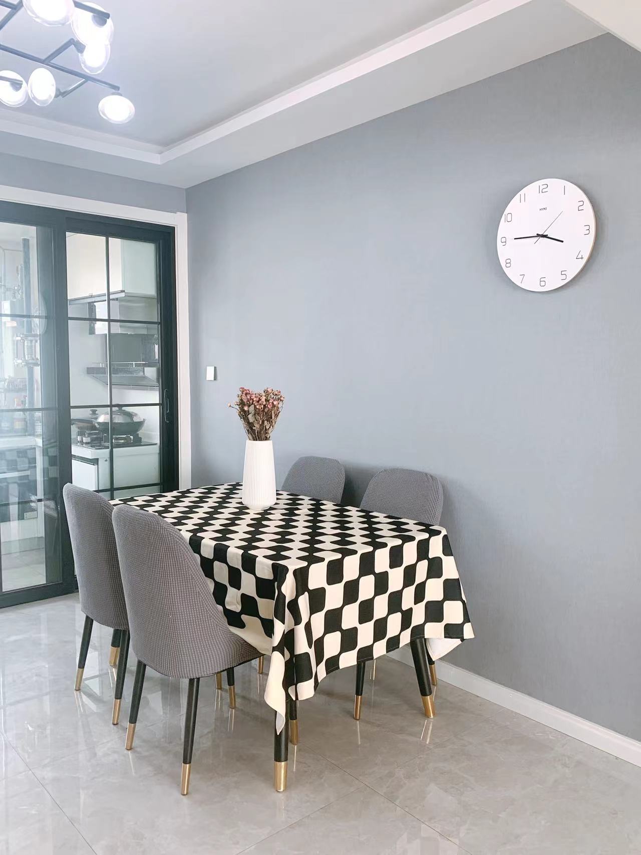 餐桌餐椅也是全友,岩板餐桌配了一张棋盘格的黑色桌布,有质感的绒面,还带防水性,来自馨生活家居。