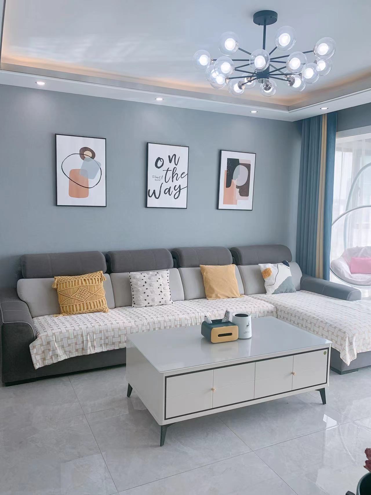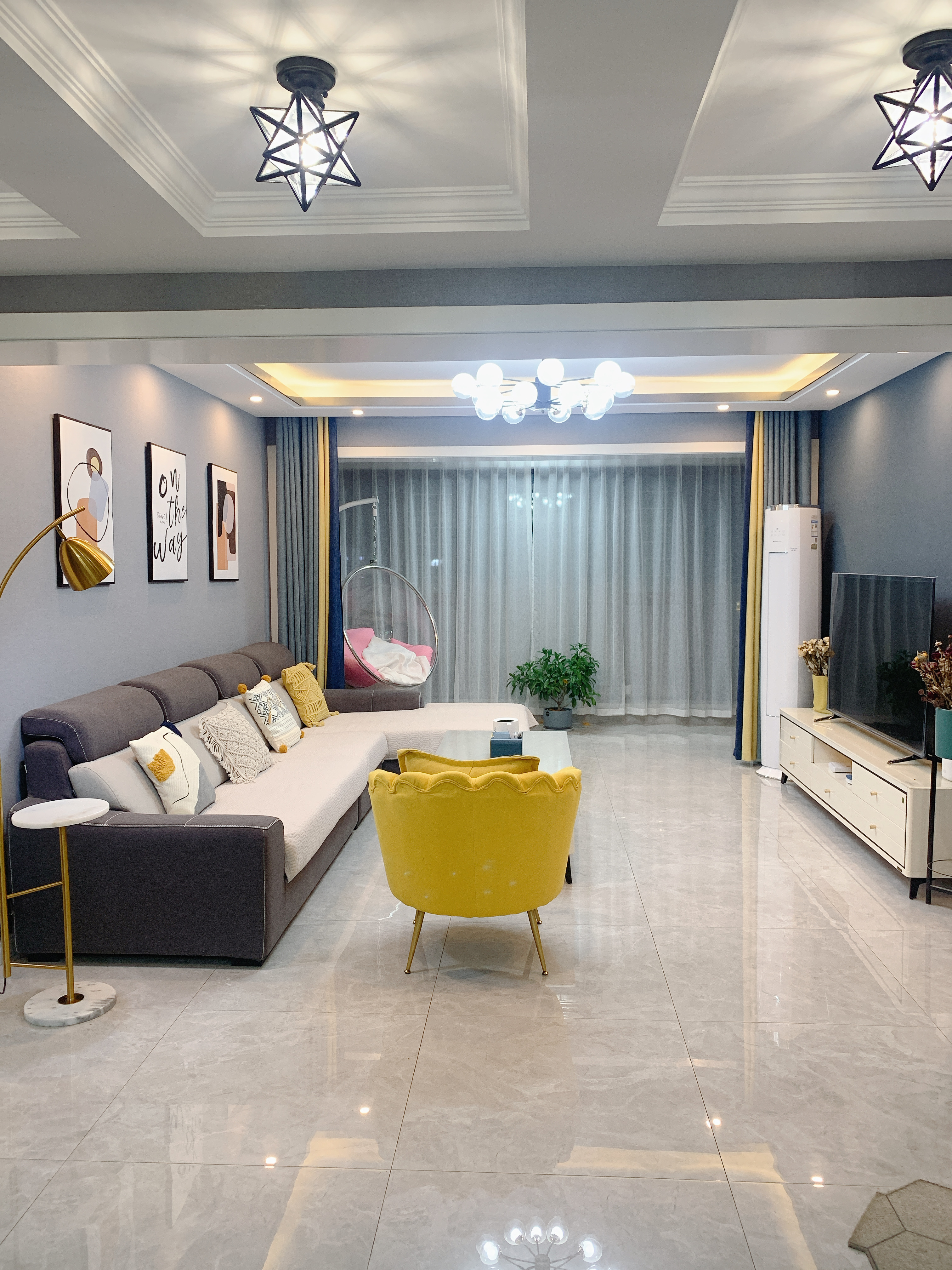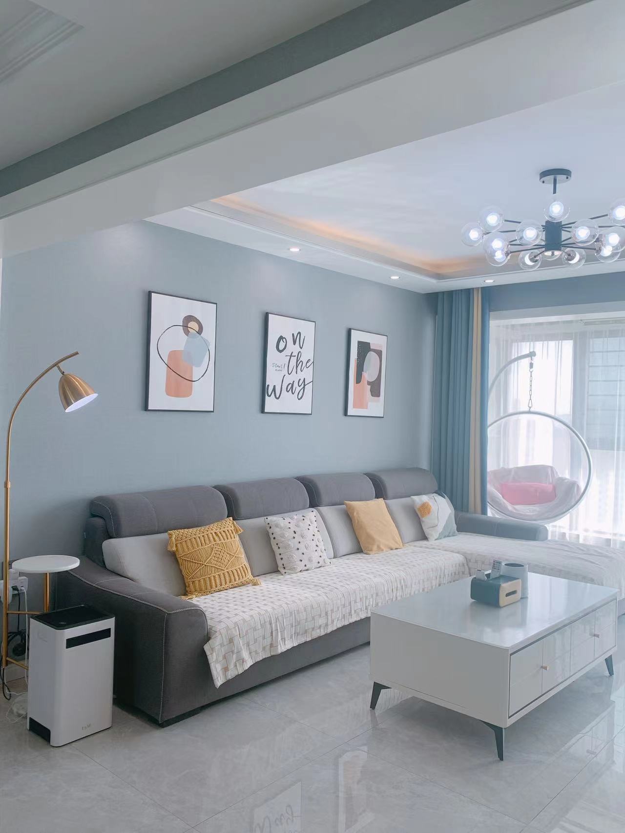 电视背景墙挂画是50*70,用的挂钉,来自慢生活家居。黄色泡泡椅是雅致藤居。电视柜长2.2米,电视配的是65寸。