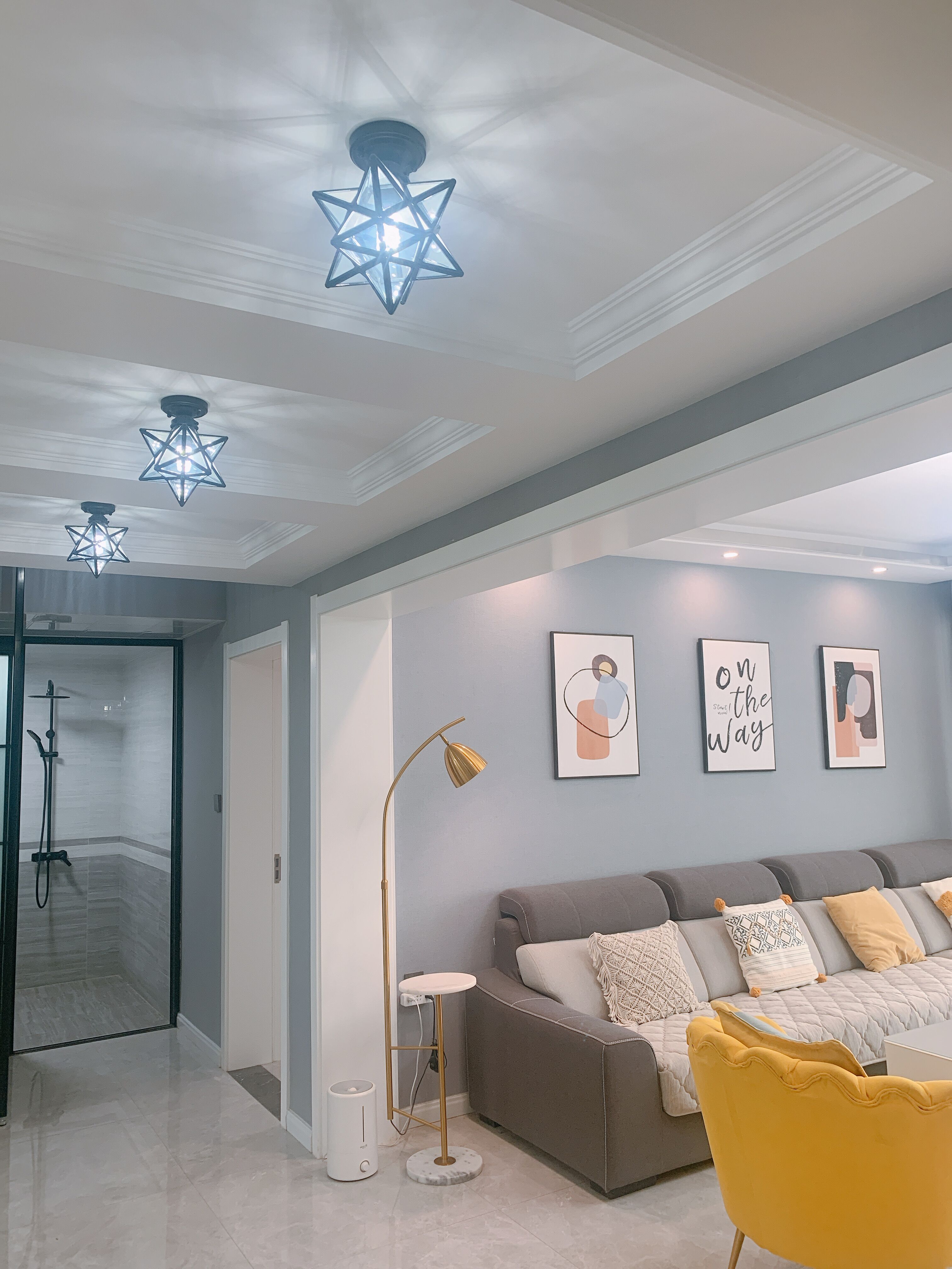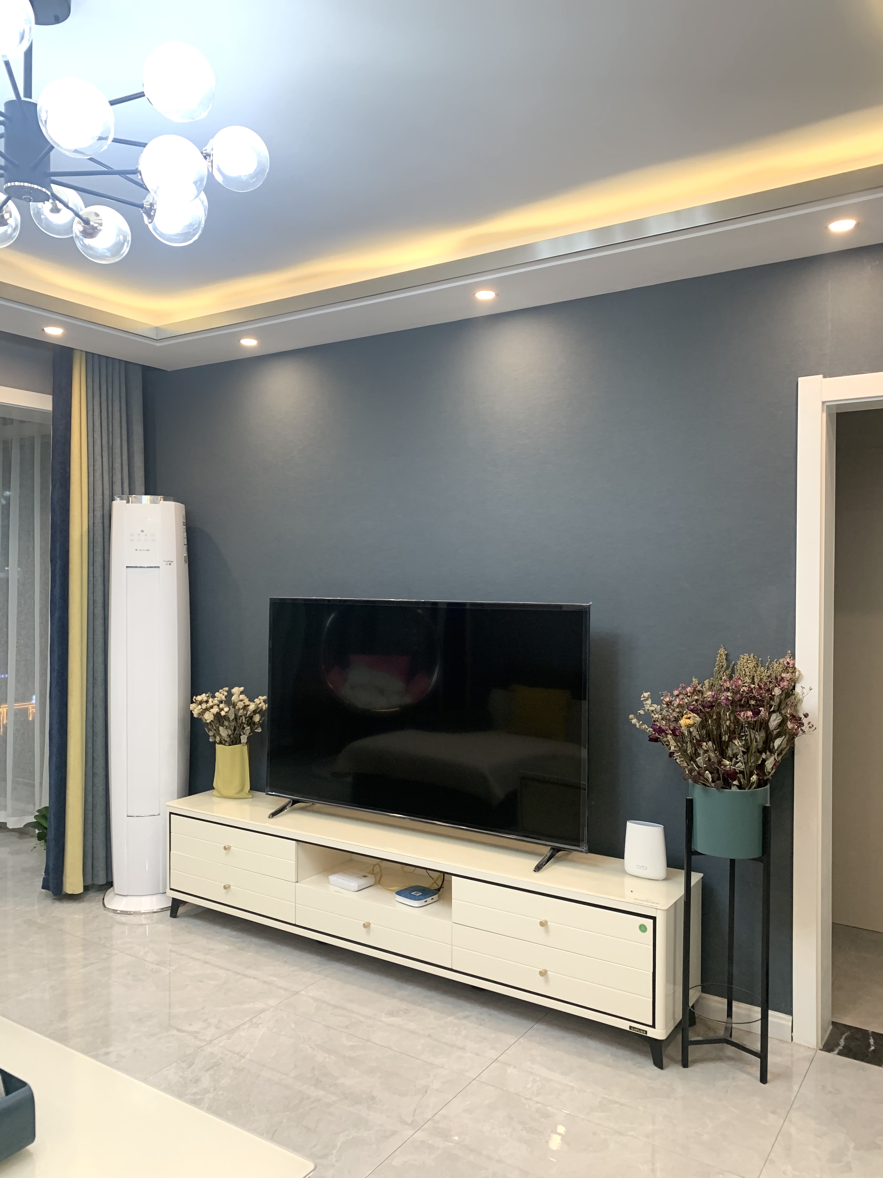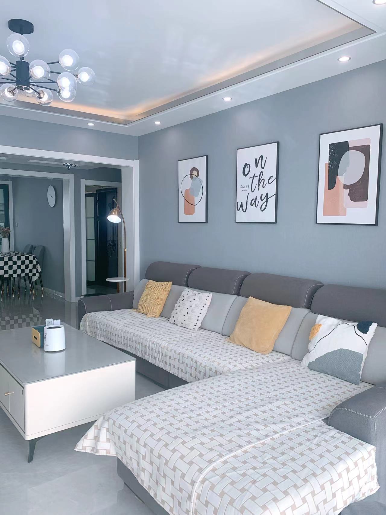 电视背景墙挂画是50*70,用的挂钉,来自慢生活家居。黄色泡泡椅是雅致藤居。电视柜长2.2米,电视配的是65寸。
