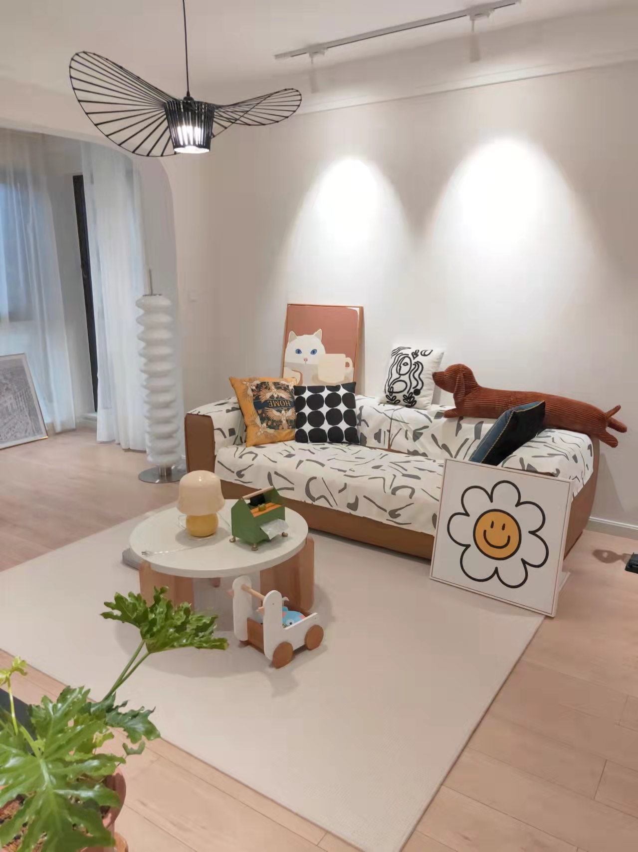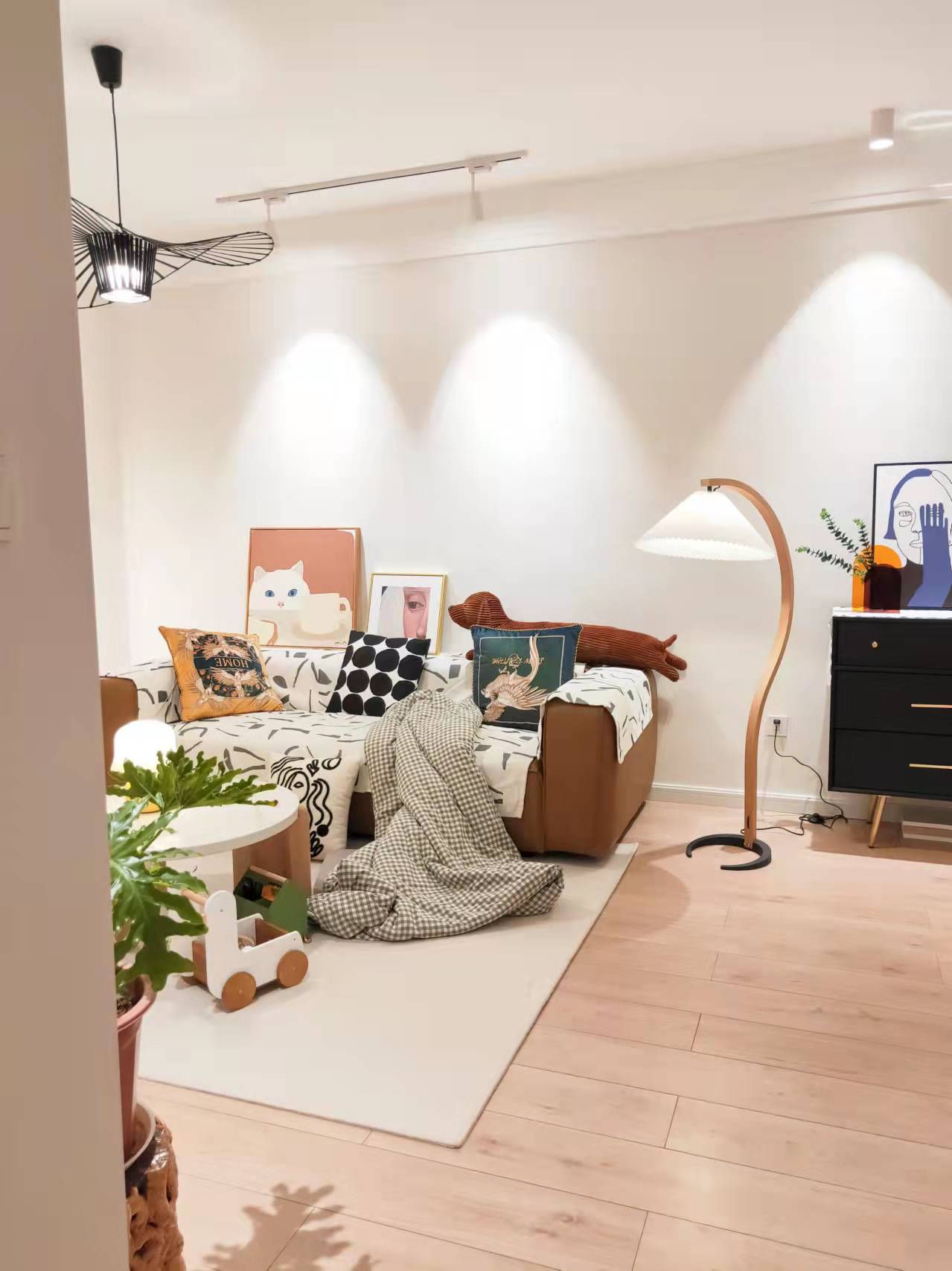 墙漆刷的是多乐士的浅滩银珠,吊顶做了个5公分厚的双眼皮吊顶,搭配3500k的射灯。走廊做了个拱门,没有门套。