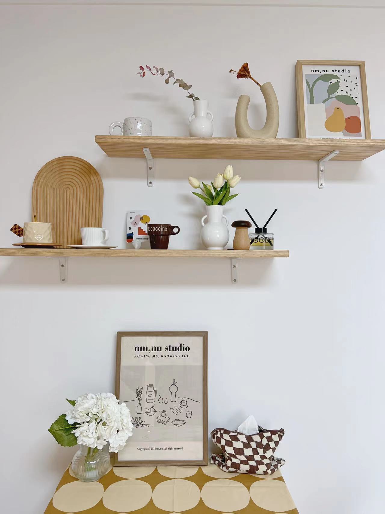 小户型没有餐边柜,就用搁板代替了。两块80*20的红橡木板,放一些小装饰很好看