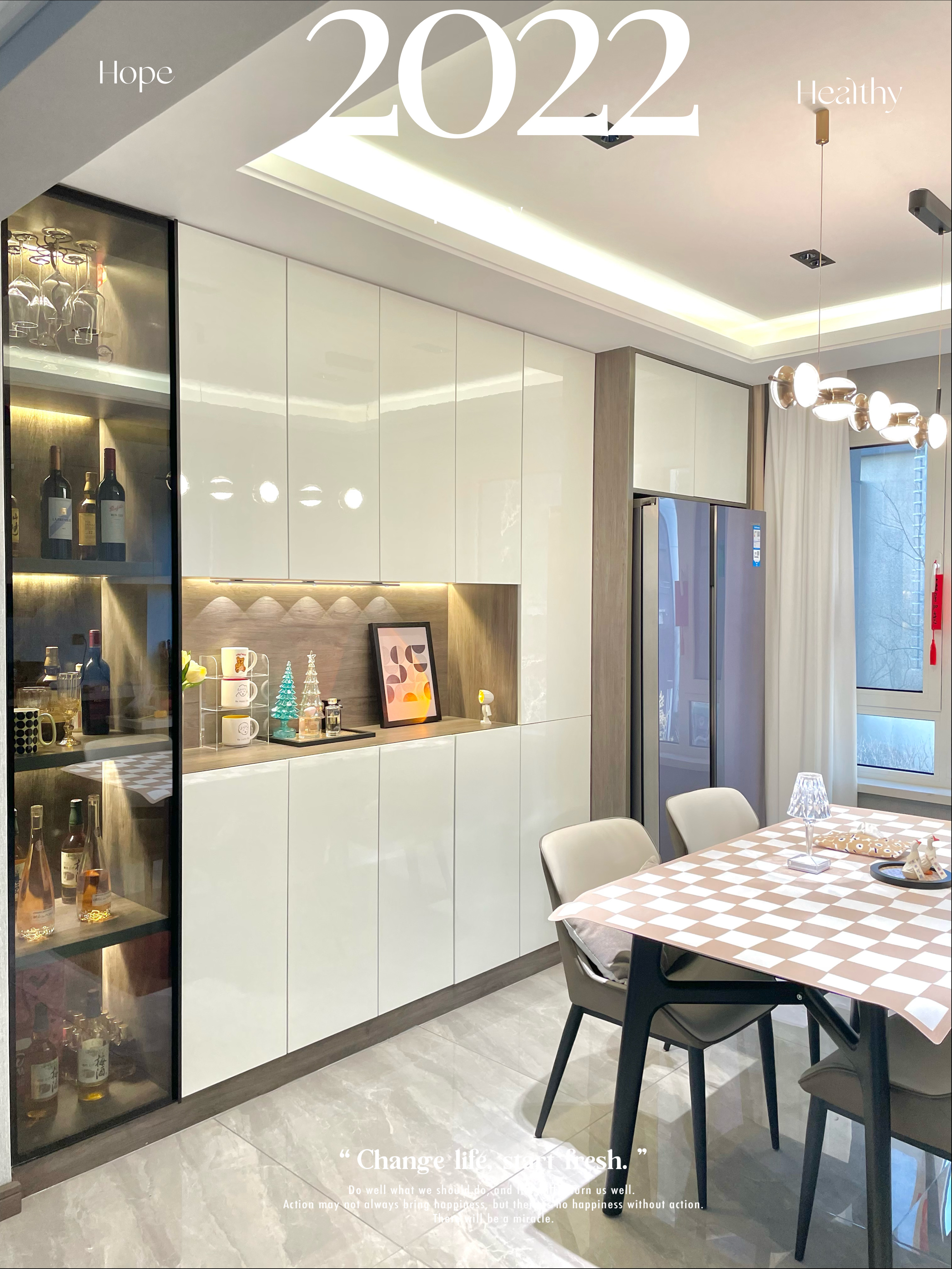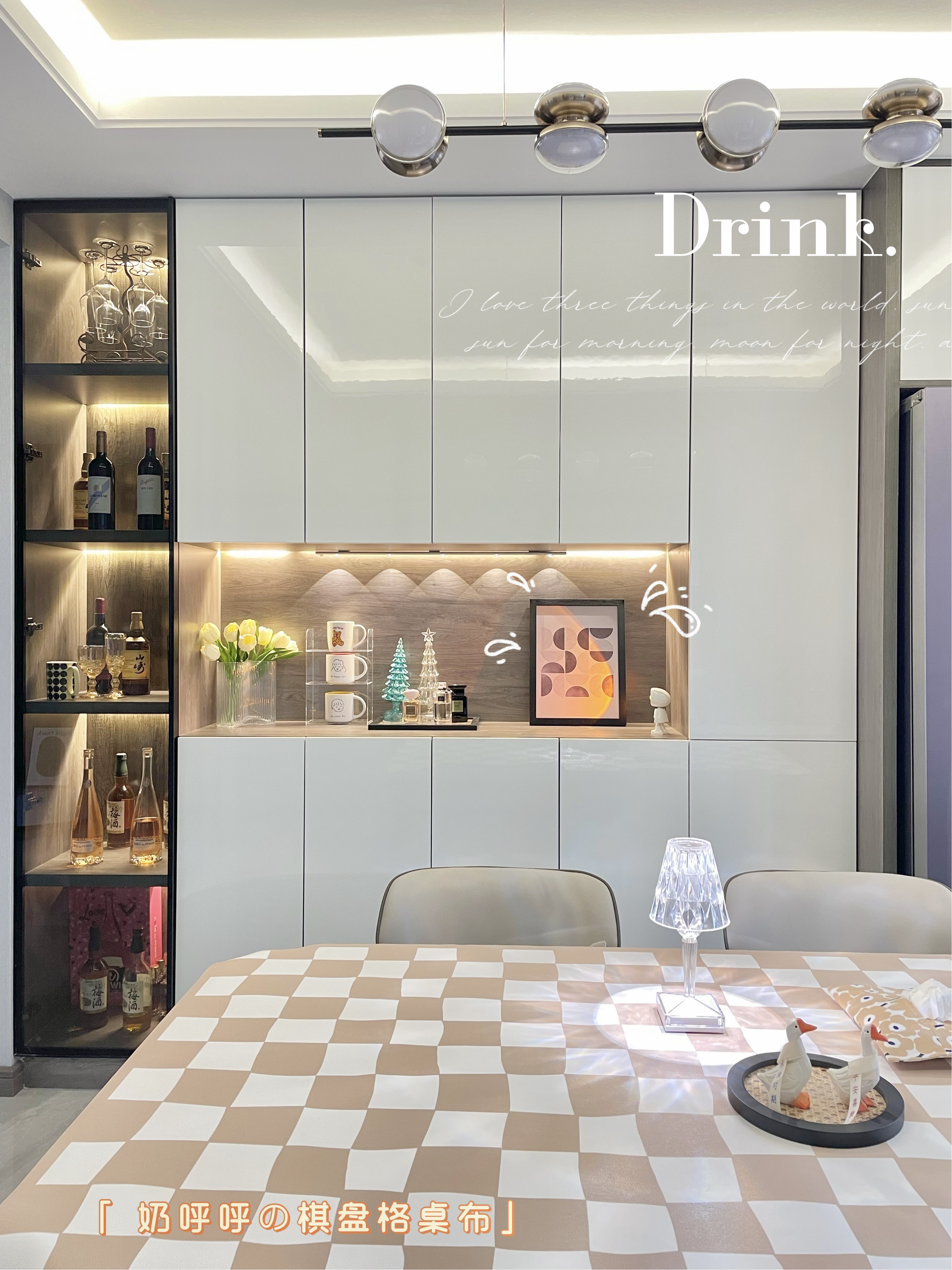 餐厅做了二级吊顶,加上灯带,氛围感十足。定制做了餐边柜,40公分的进深,灰咖色的柜体,加上白色柜门和灰色玻璃柜门。