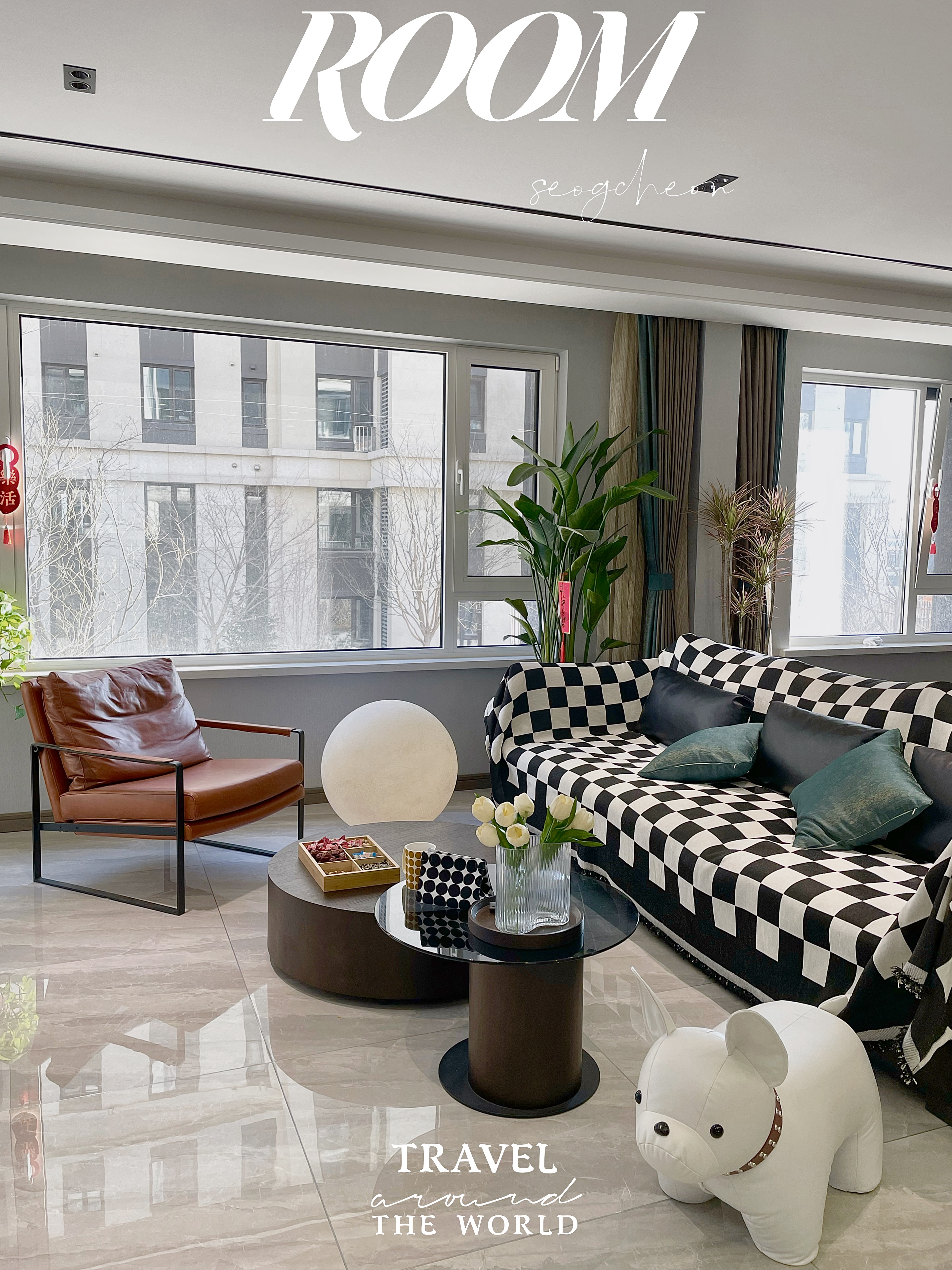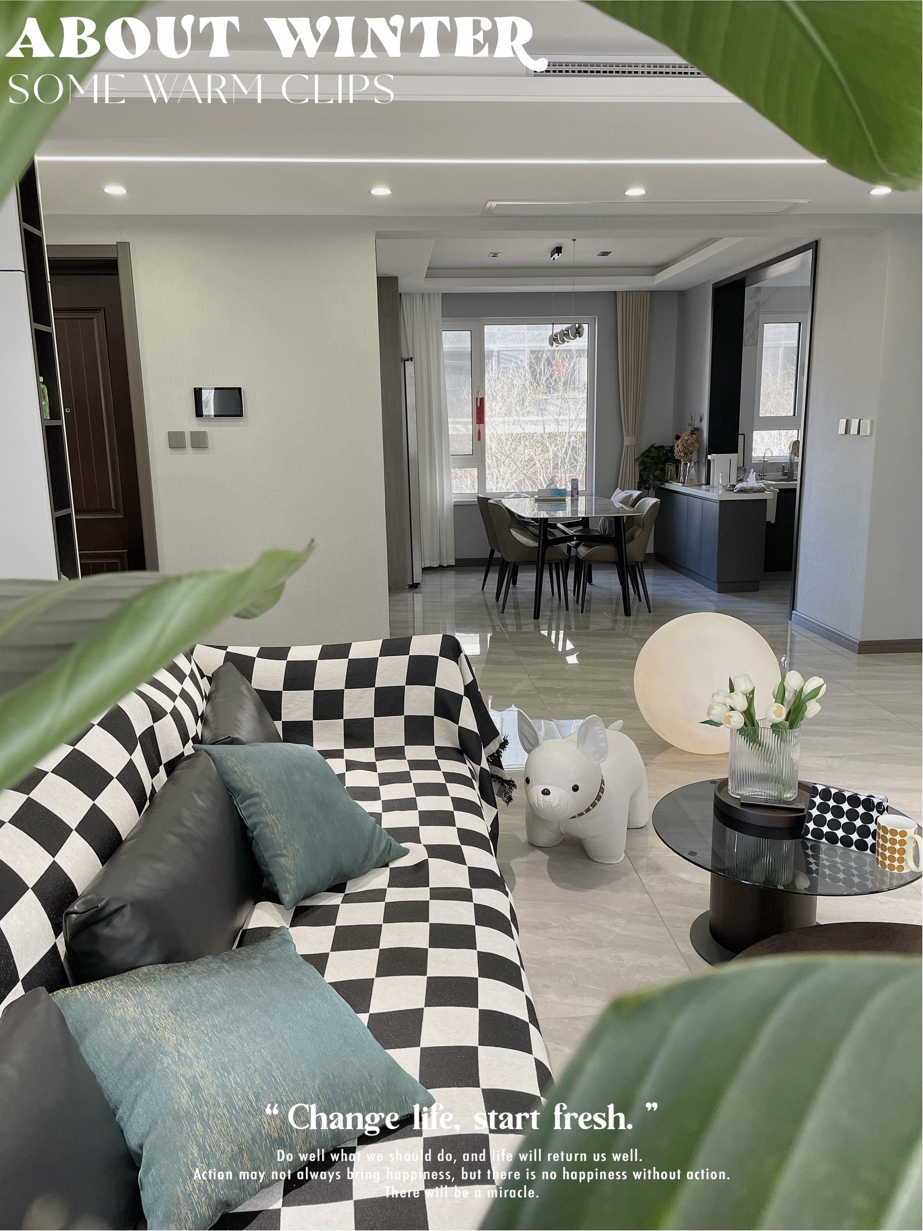给客厅的皮沙发也换了一块新的盖巾,同样是棋盘格元素的,双面可用,时髦好看,再也不怕皮沙发秋冬凉了。