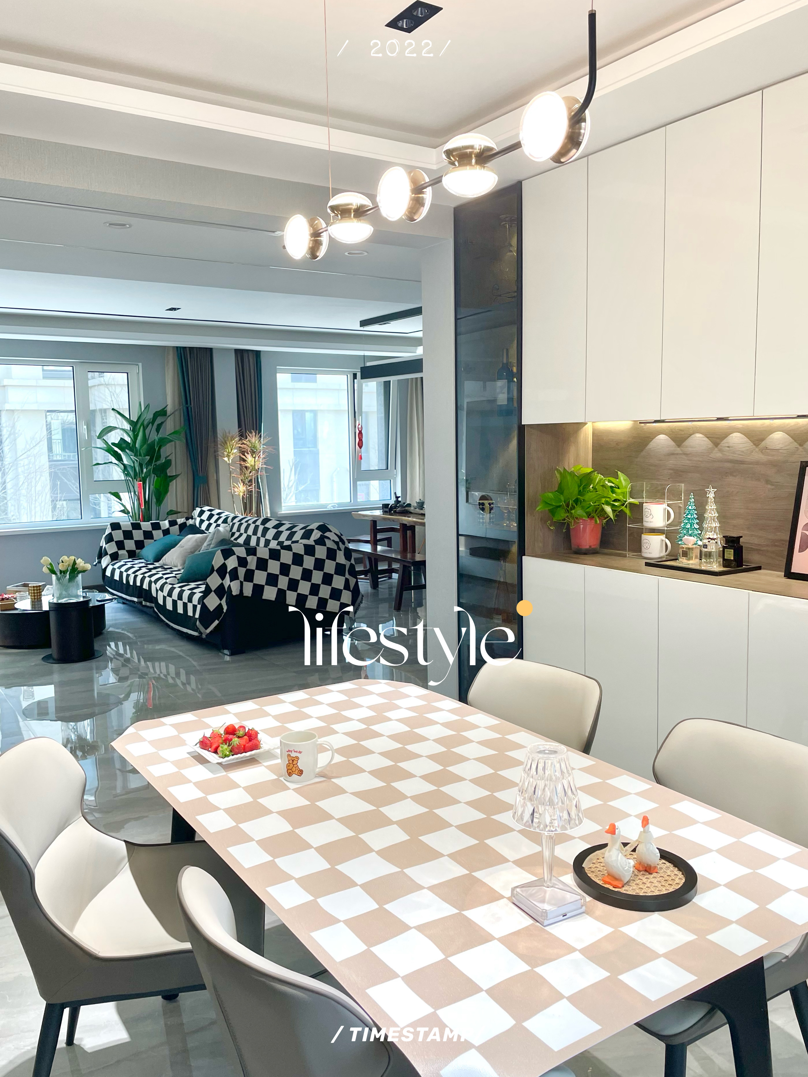 餐桌是90*180的岩板餐桌,放东西容易有声音。配了一块棋盘格的桌垫,防水防油,打理也很省心。
