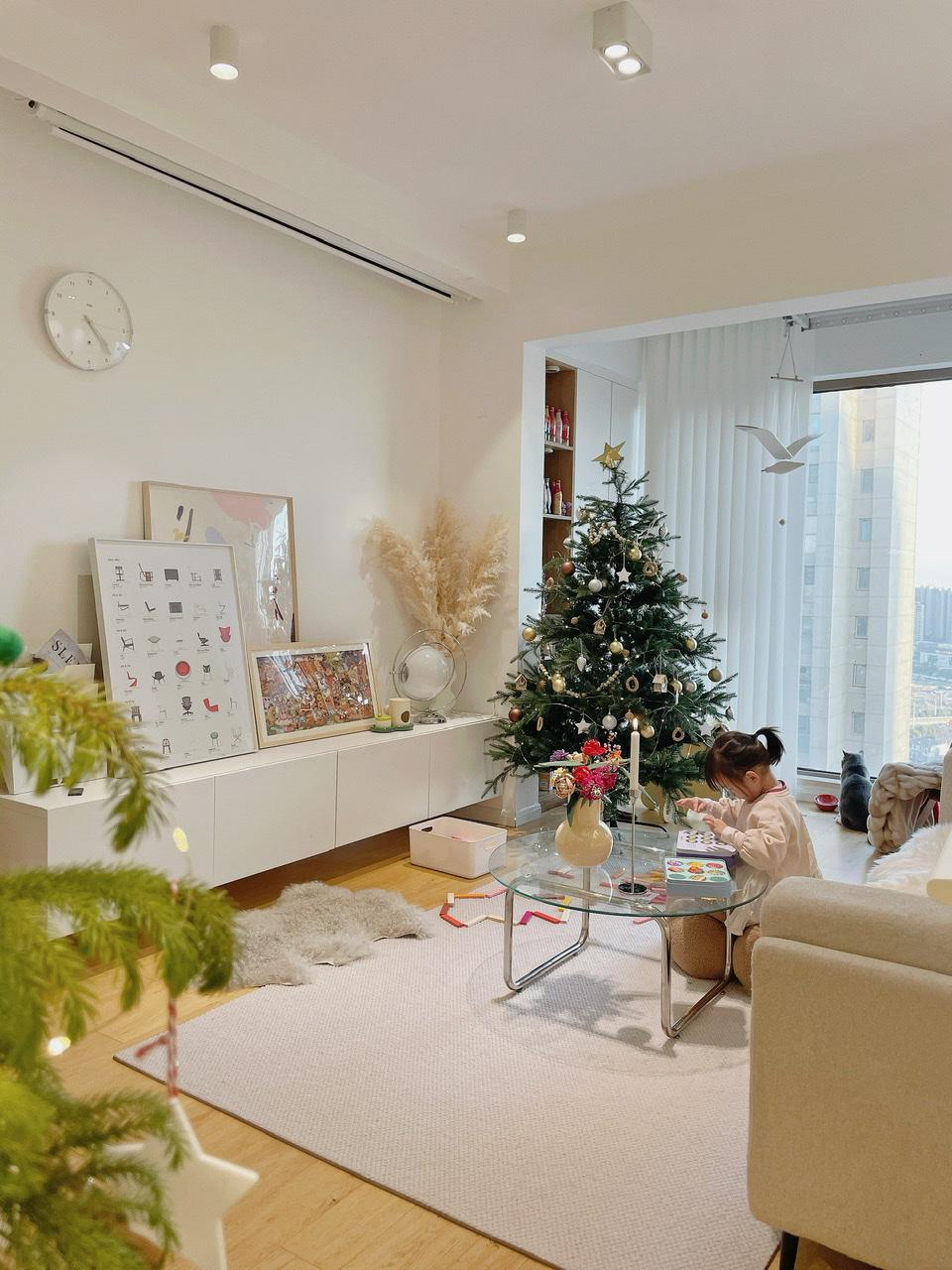 客餐厅沙发背景墙用的云雾青,其他都是简单的大白墙。