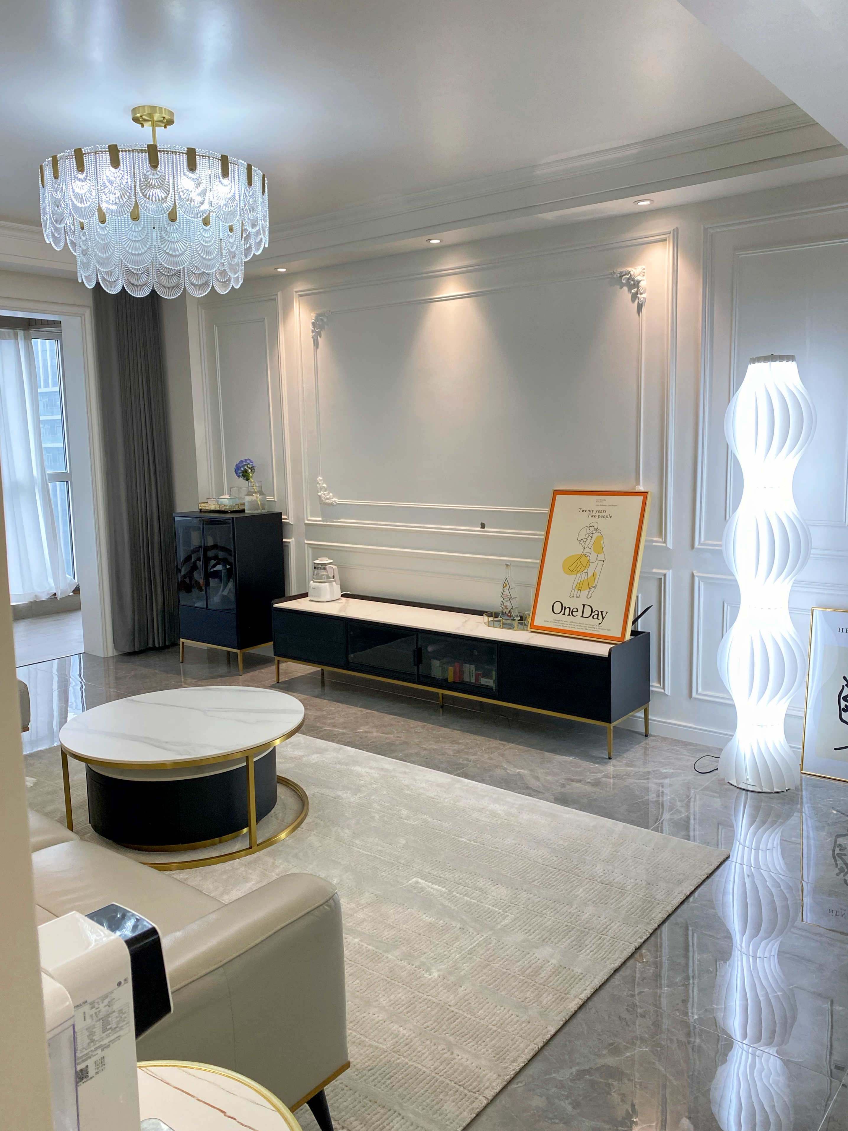 电视柜和茶几都是配套的,雪山白色,岩板的台面宜洛