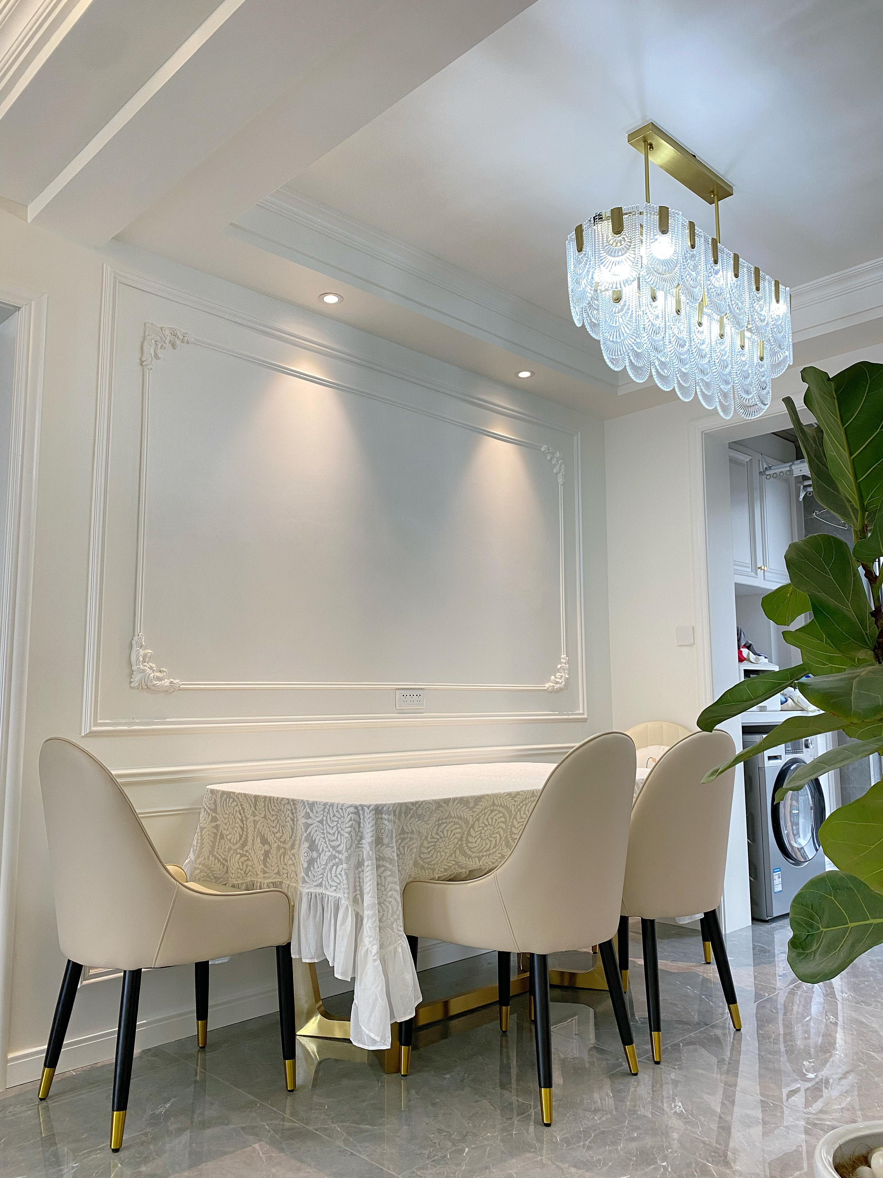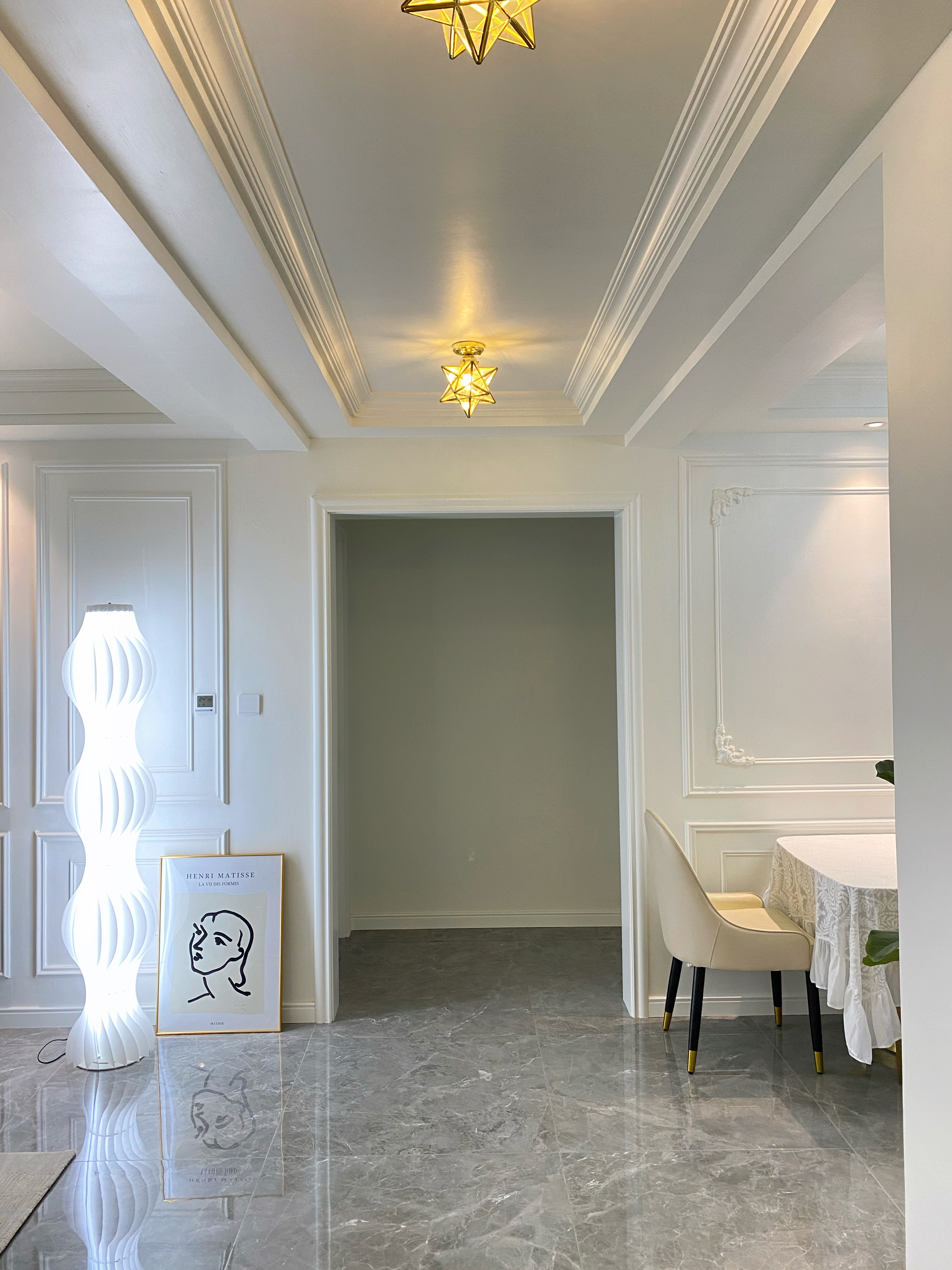 吊顶是20*18的公分的边吊,走一圈10公分的石膏线。墙面贴的是pu线条,通刷了佐敦白色乳胶漆。