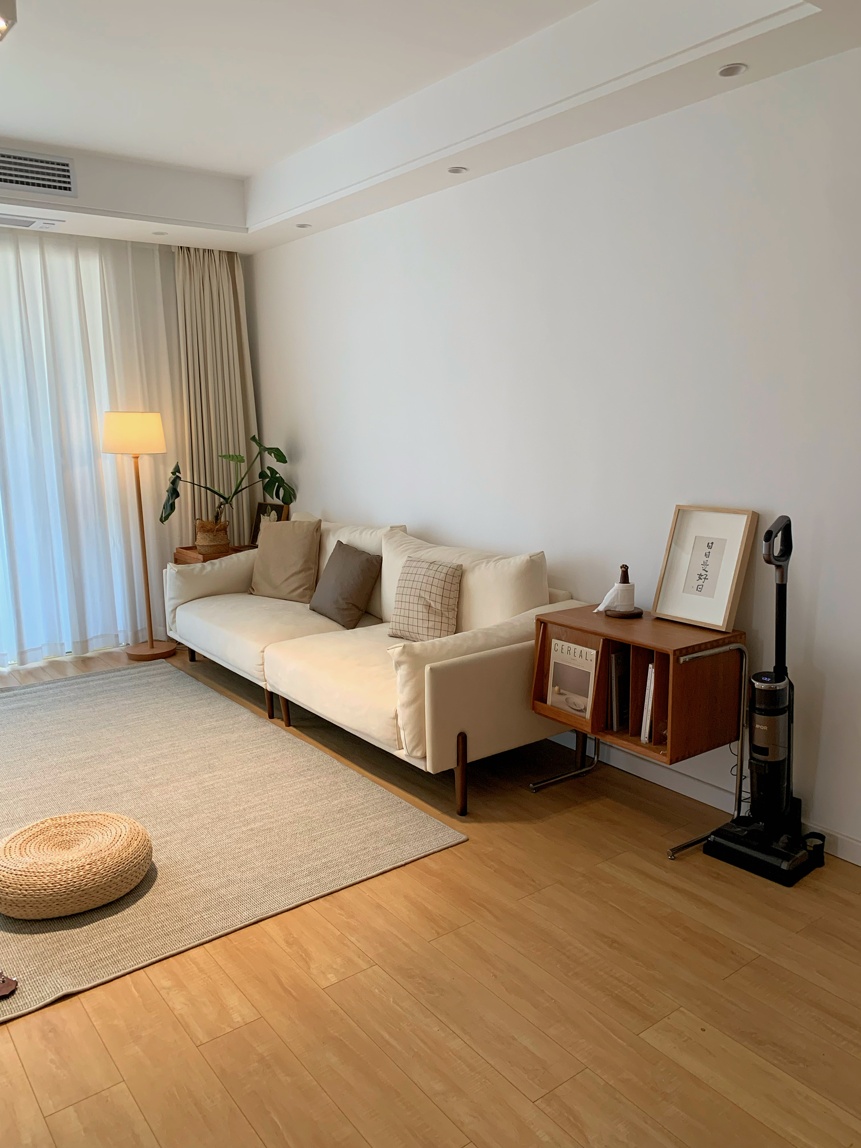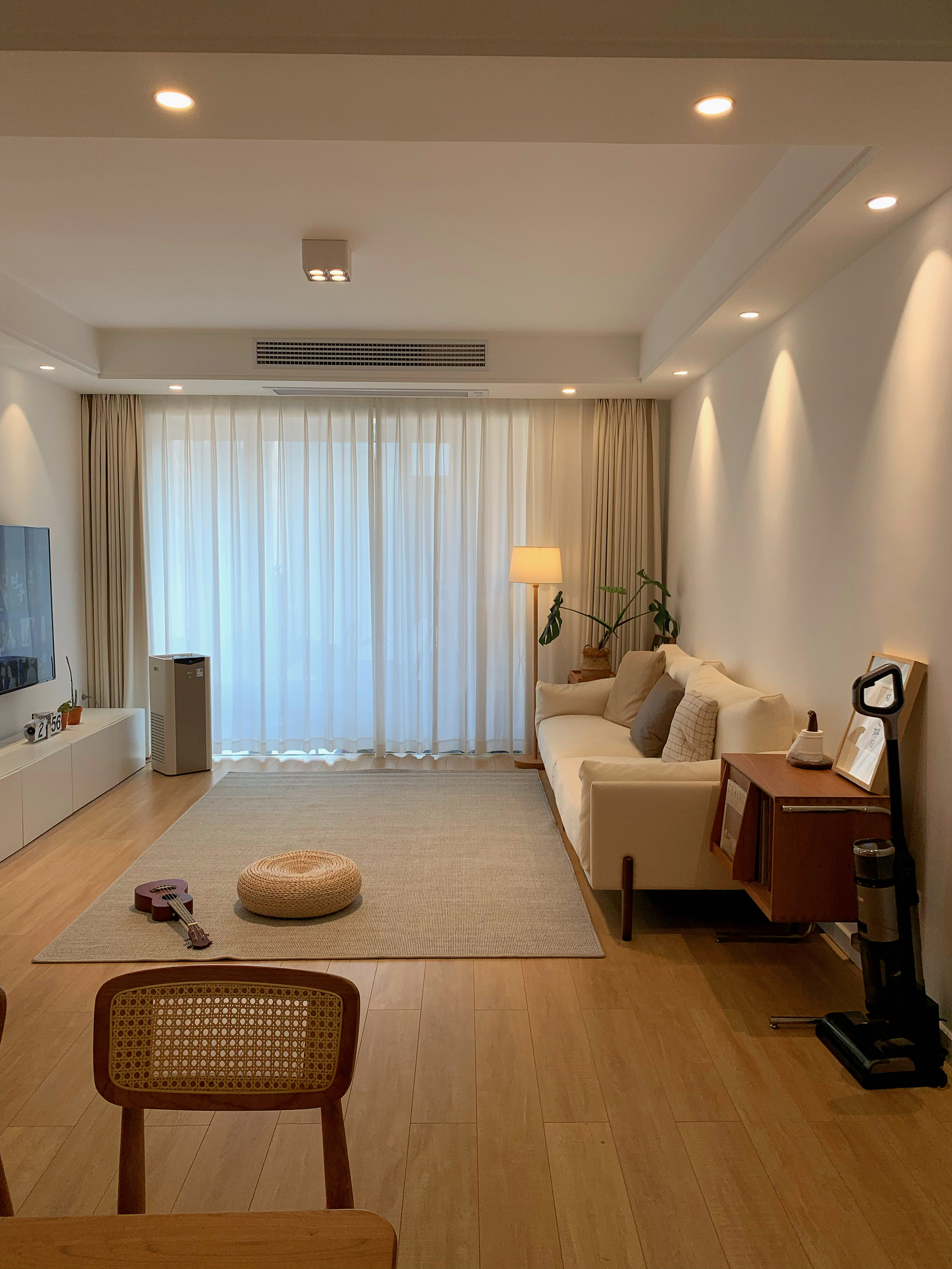 木地板,型号是大自然的岚橡浮动,比较温柔的原木色。复合木材质,比较好打理,配的踢脚线也是平板的纯白色。