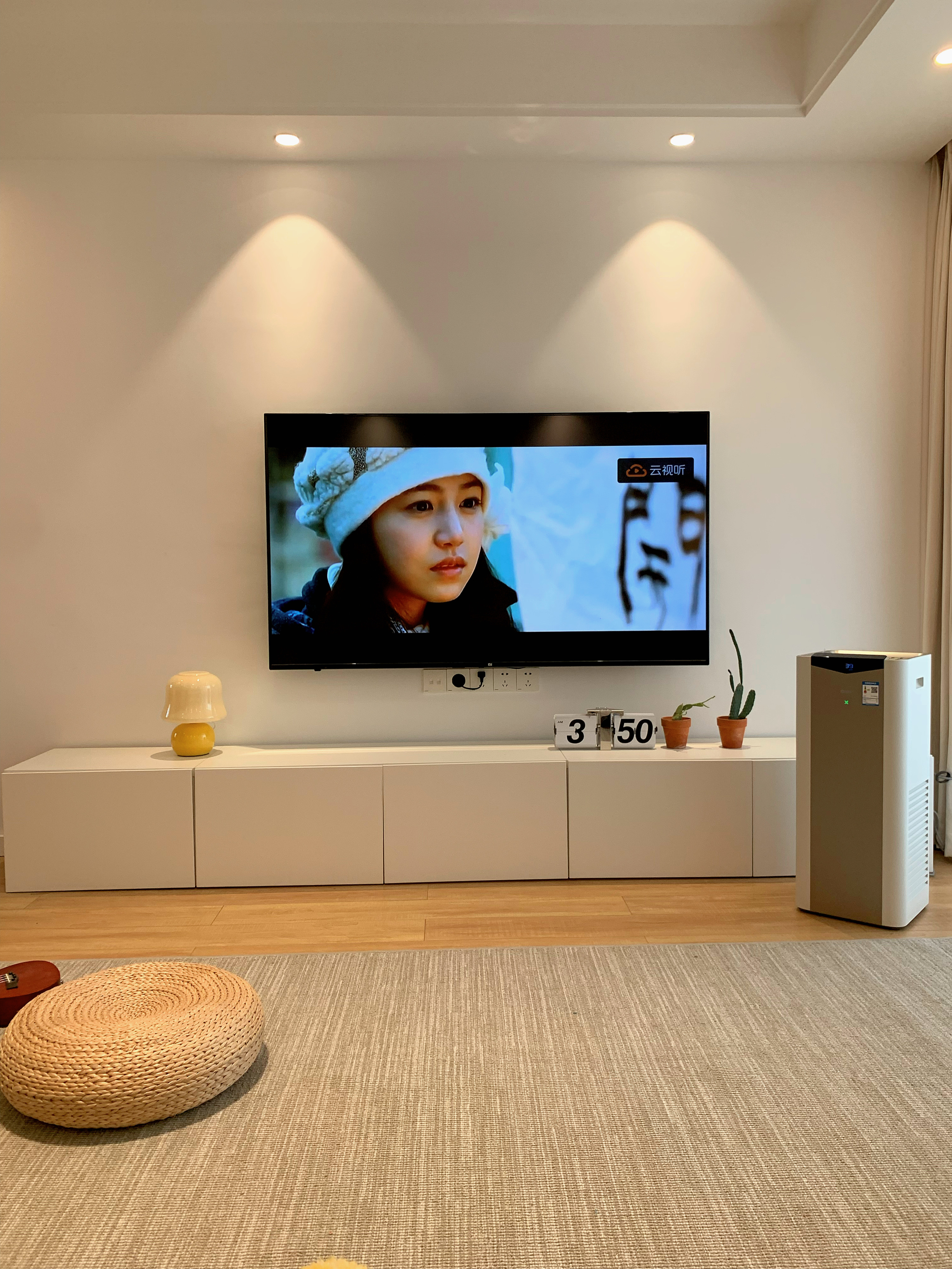 色温统一3500k,沙发和电视背景墙使用的射灯,其他地方用的是筒灯。