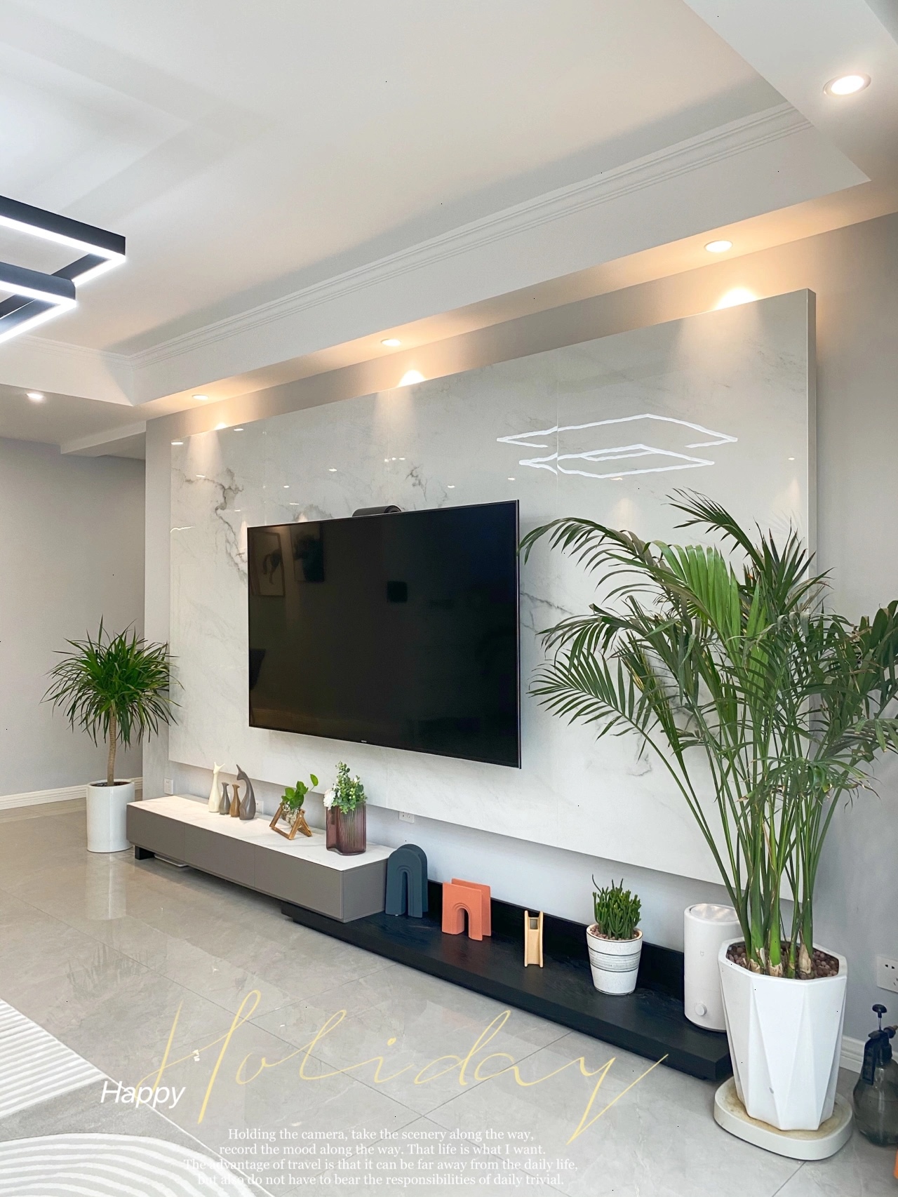 瓷砖选的是冠珠的暖灰色,美缝用的贵族银,全屋算上人工费花了不到2w。电视背景墙用的是仿大理石瓷砖,花了3000。
