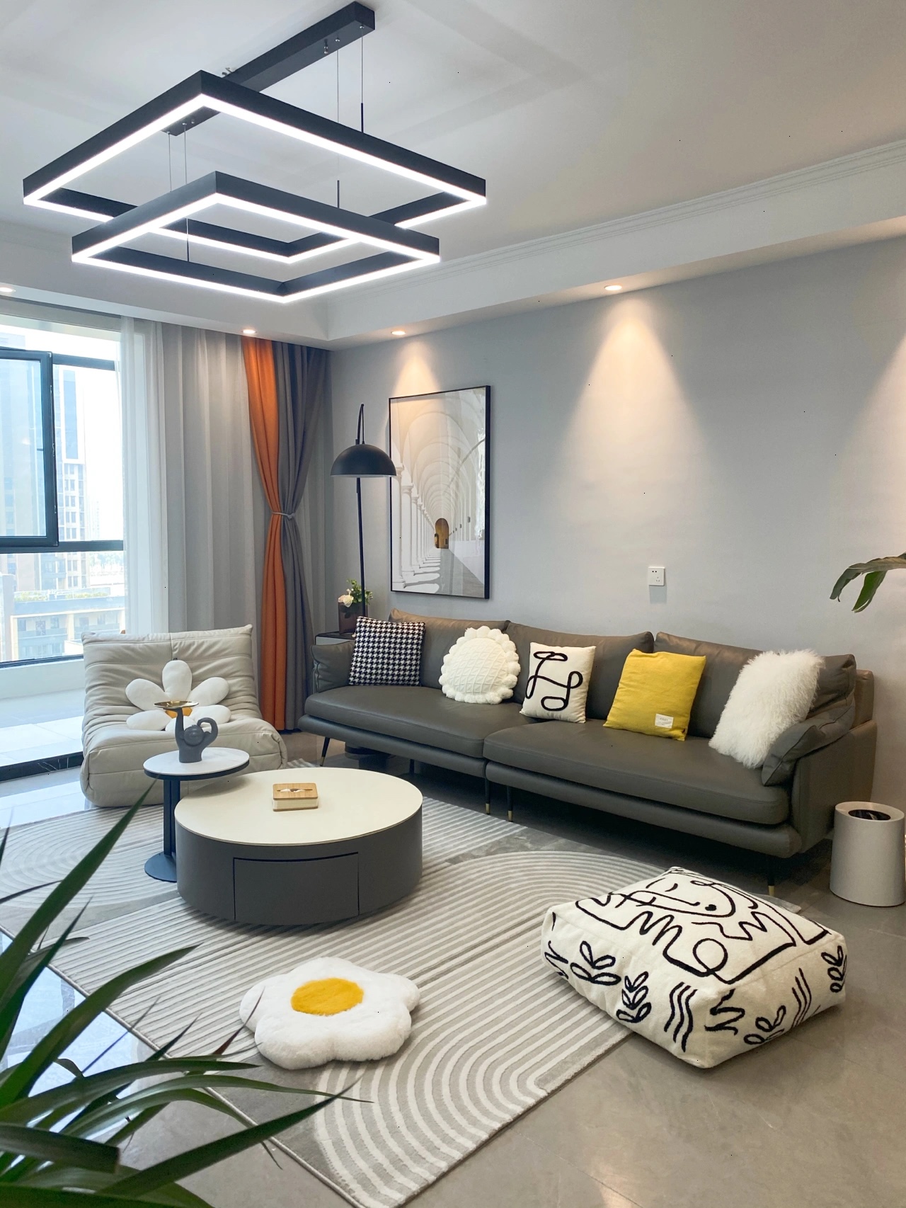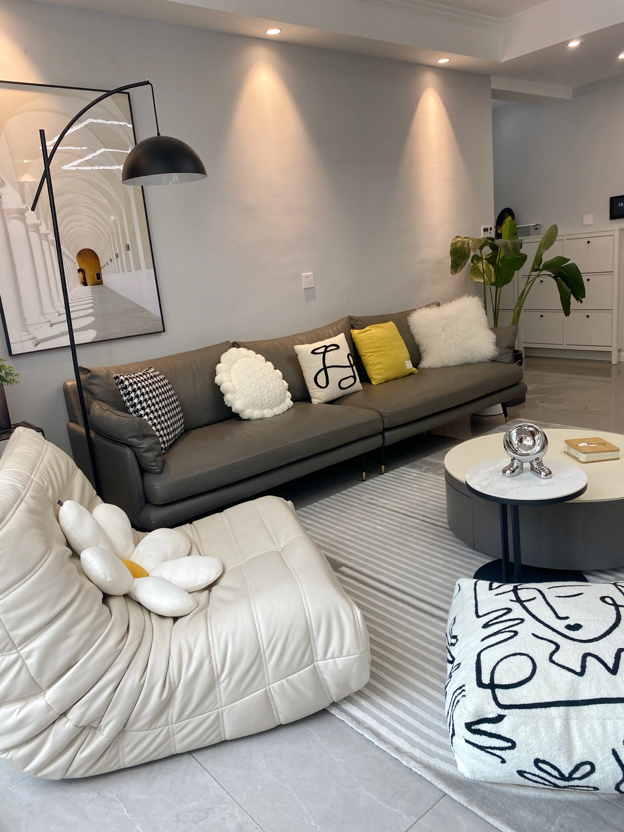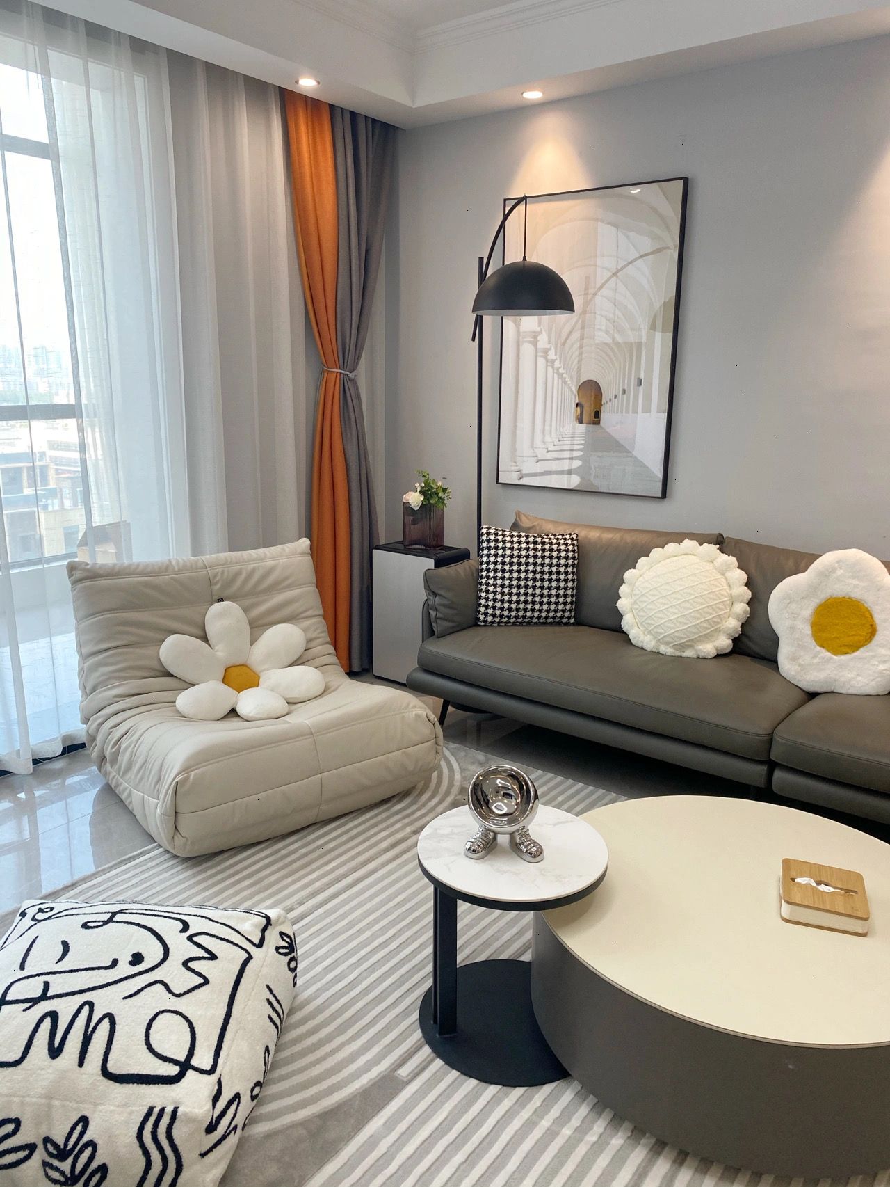沙发是半躺主义的。懒人坐垫是馨生活家居的,黑白图案特别高级。茶几、电视和餐桌是灿森家具的。