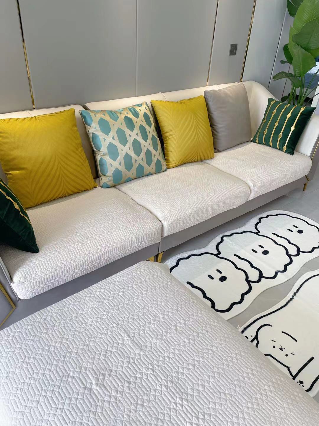 沙发是实体店买的,长2.9米。配上了纯棉的沙发垫,很舒服也耐脏,可以机洗很方便,来自馨生活家居。