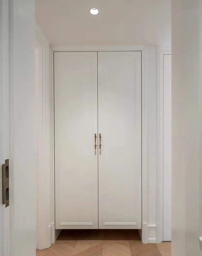 左侧设计一个玄关衣帽间:衣柜+鞋柜,存放外出常穿的外套、鞋子、包等,满足业主归家后净衣的需求。