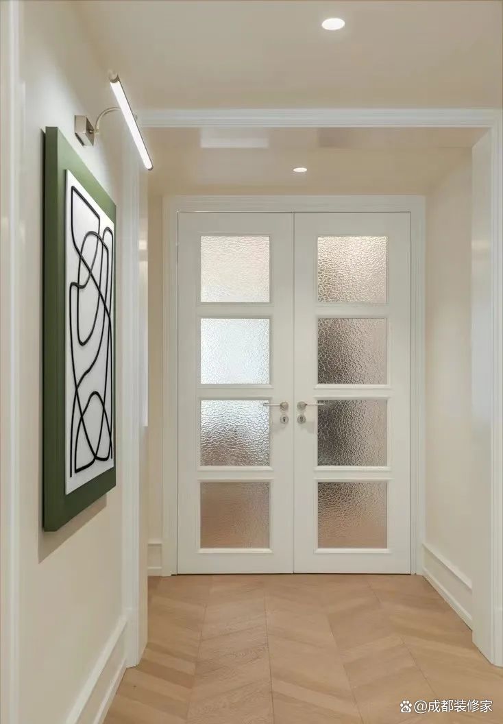书房使用双开门设计,水波纹玻璃,透光不透人,凸显朦胧美,让走廊空间更加通透。