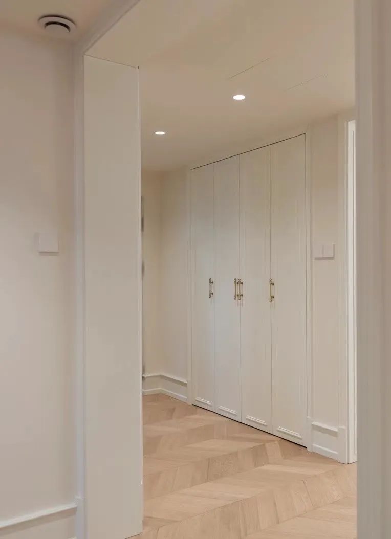 全屋通铺鱼骨拼接地板,与墙面的石膏线条形成立体的美感,烘托出柔和的法式味道。