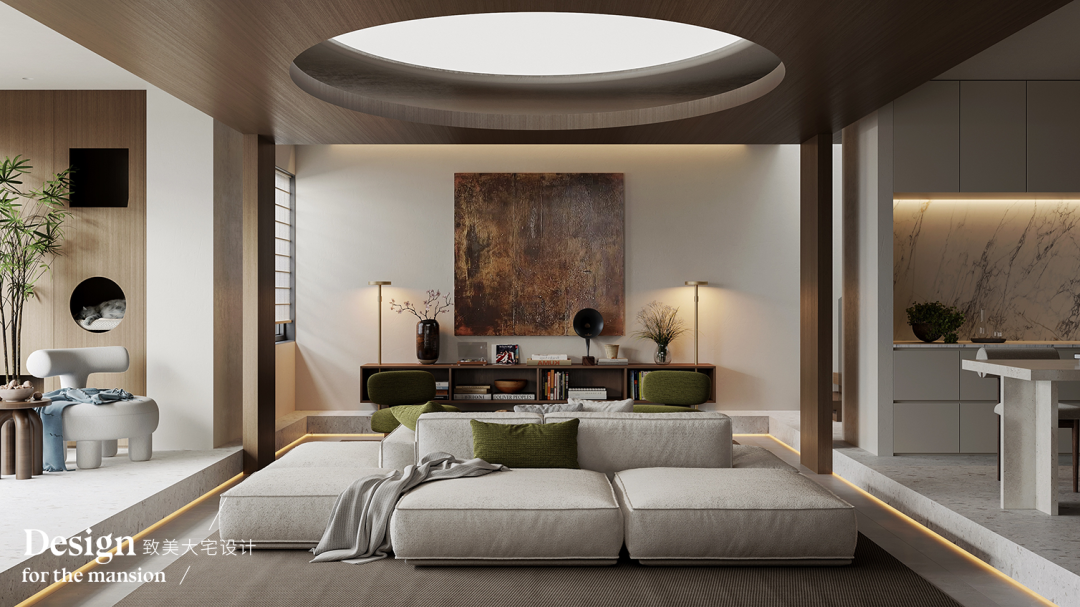 ➋. 抬高餐厅,自然形成入户落尘区和下沉式客厅,从餐厅过渡到客厅,有豁然开朗的大宅感;