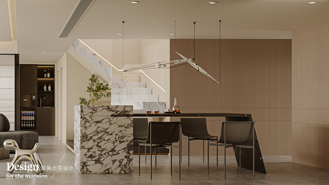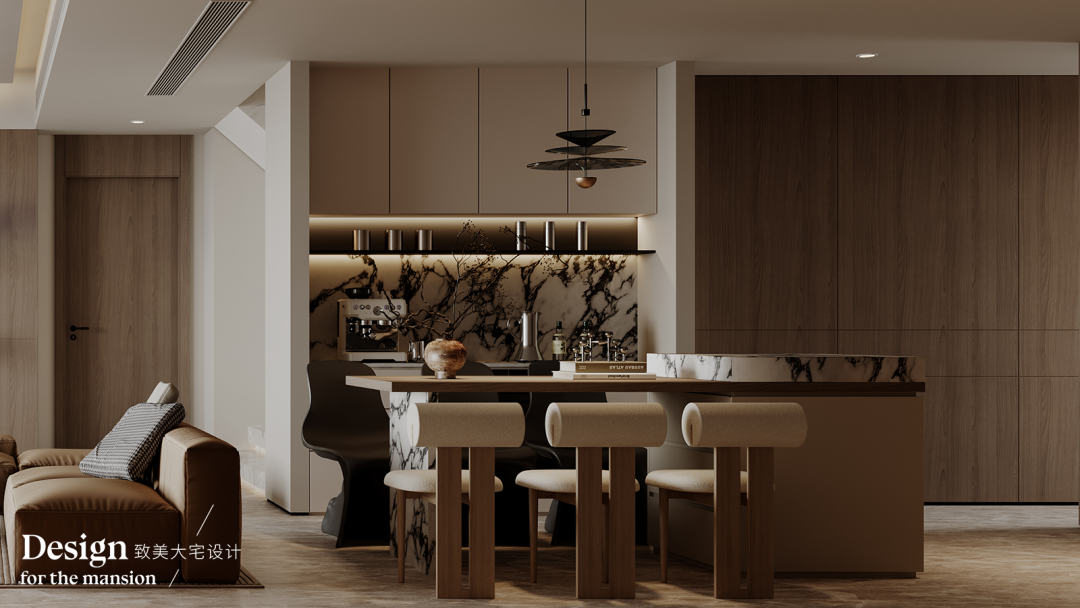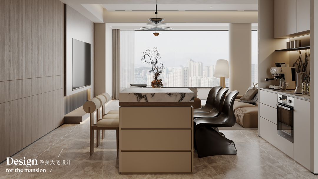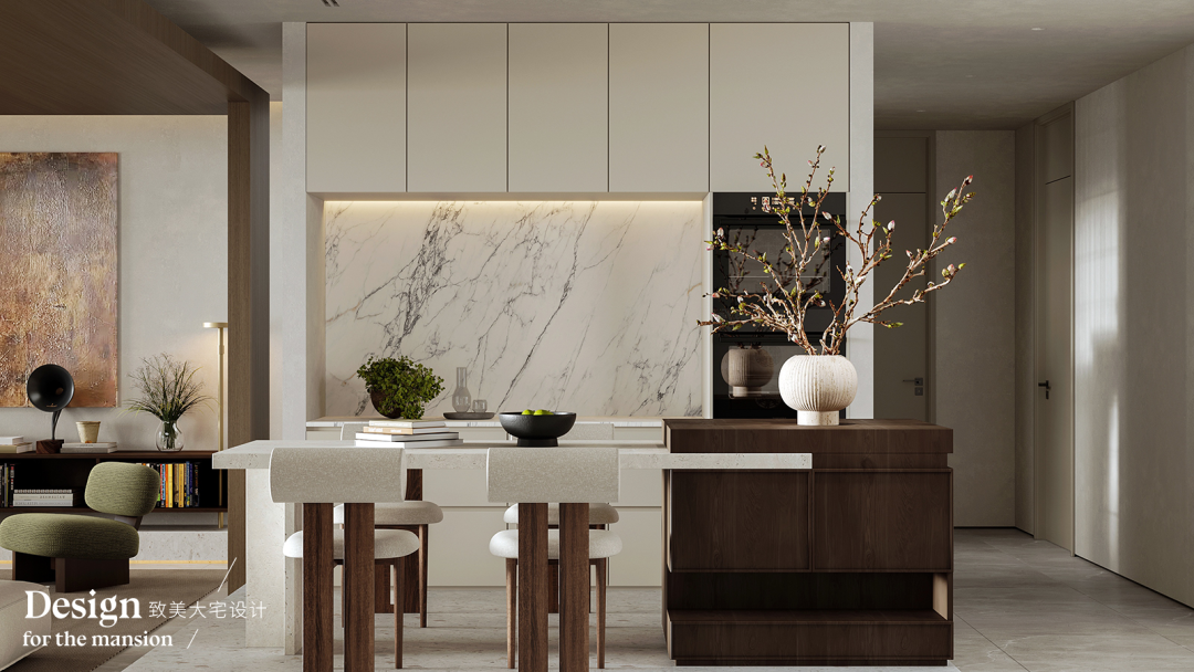 ❹. 餐厅使用餐岛一体设计,增加收纳和快手简餐操作台,无需进出厨房,在与家人朋友的谈笑间即可完成。
