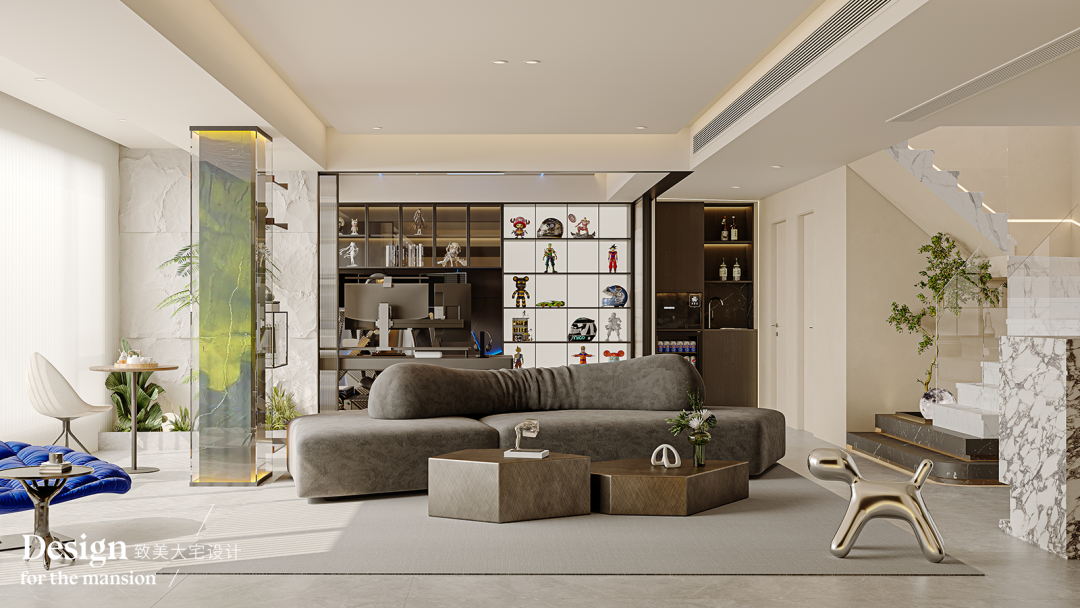 ➊. 拆除楼下套房,形成交互式大客厅,楼梯改造为玻璃栏板,阳台门洞承重柱改造为颜值亮点,配合隐形门保证墙面完整度,让公区开敞明亮、整体性强;