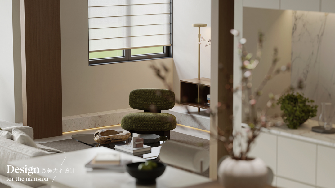 ➌. 设置阳台茶室,地台由厅柜延伸而出,减少阳台与客厅的割裂感,同时作为茶室和儿童游乐区;