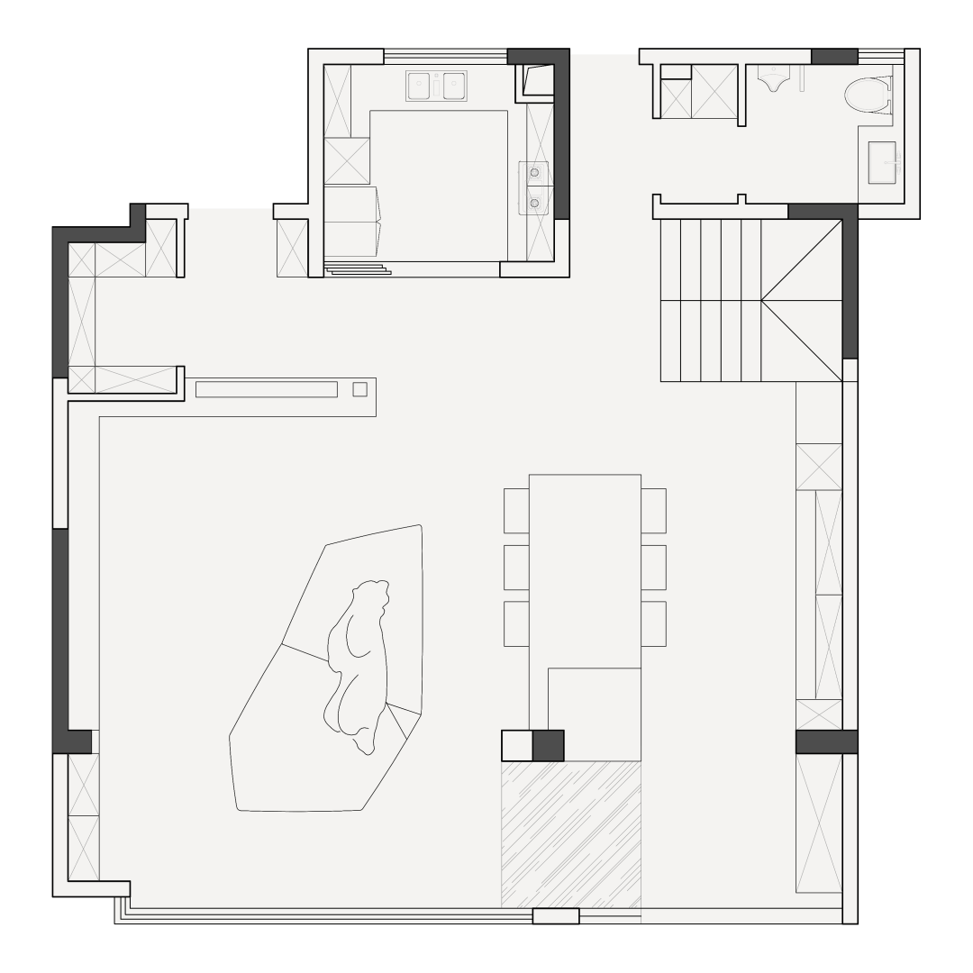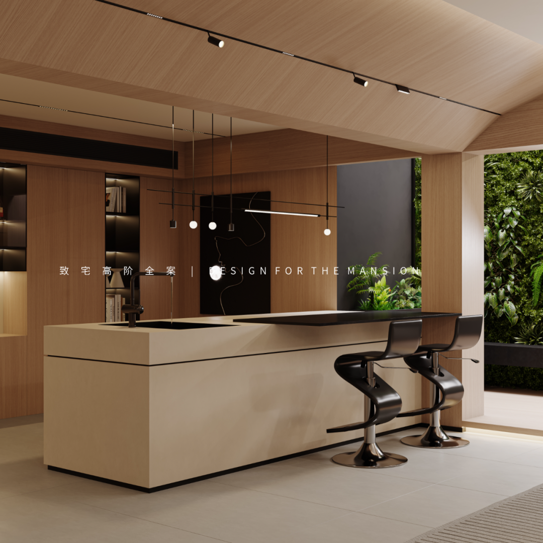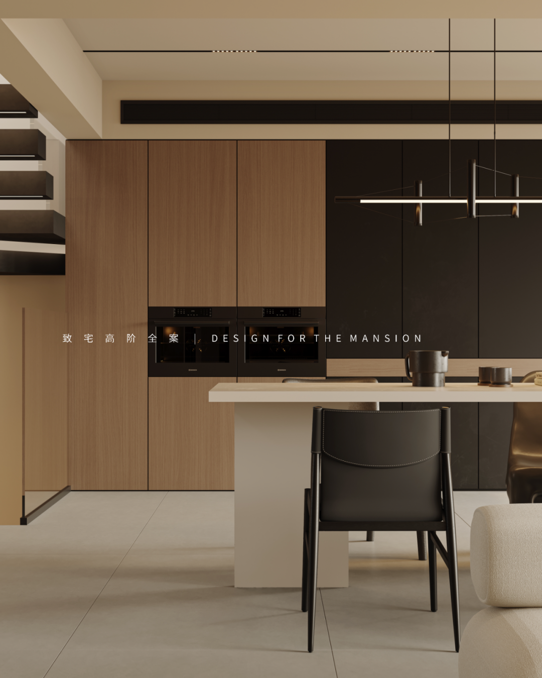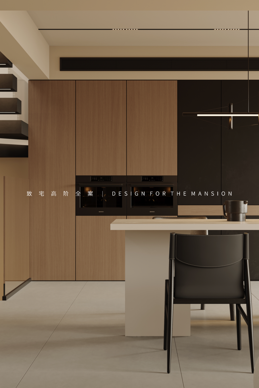 餐岛区是户型与功能间教科书般的结合,由于本层需要为负一层预留采光井,以及有无法拆除的梁和柱,设计师直接以柱为始,与梁找齐,延伸出岛台和长桌。
