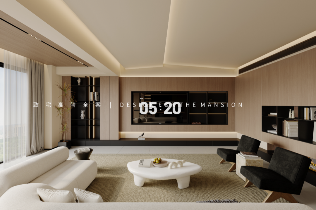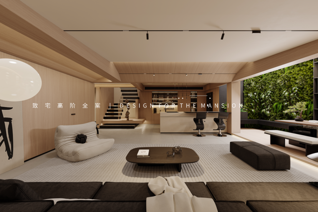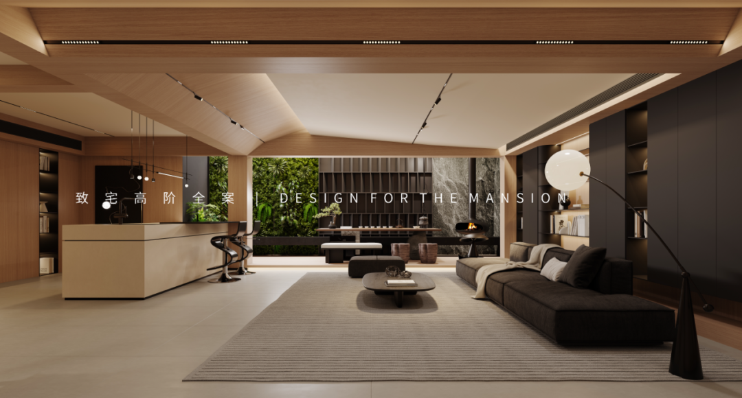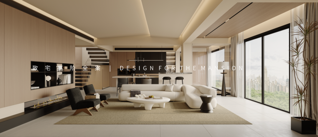在极致的空间跨度下,设计师使用屋脊结构天花板,避免传统无主灯设计的寡淡,通过视觉重心转移弱化梁的存在,并完美实现隐形功能分区。