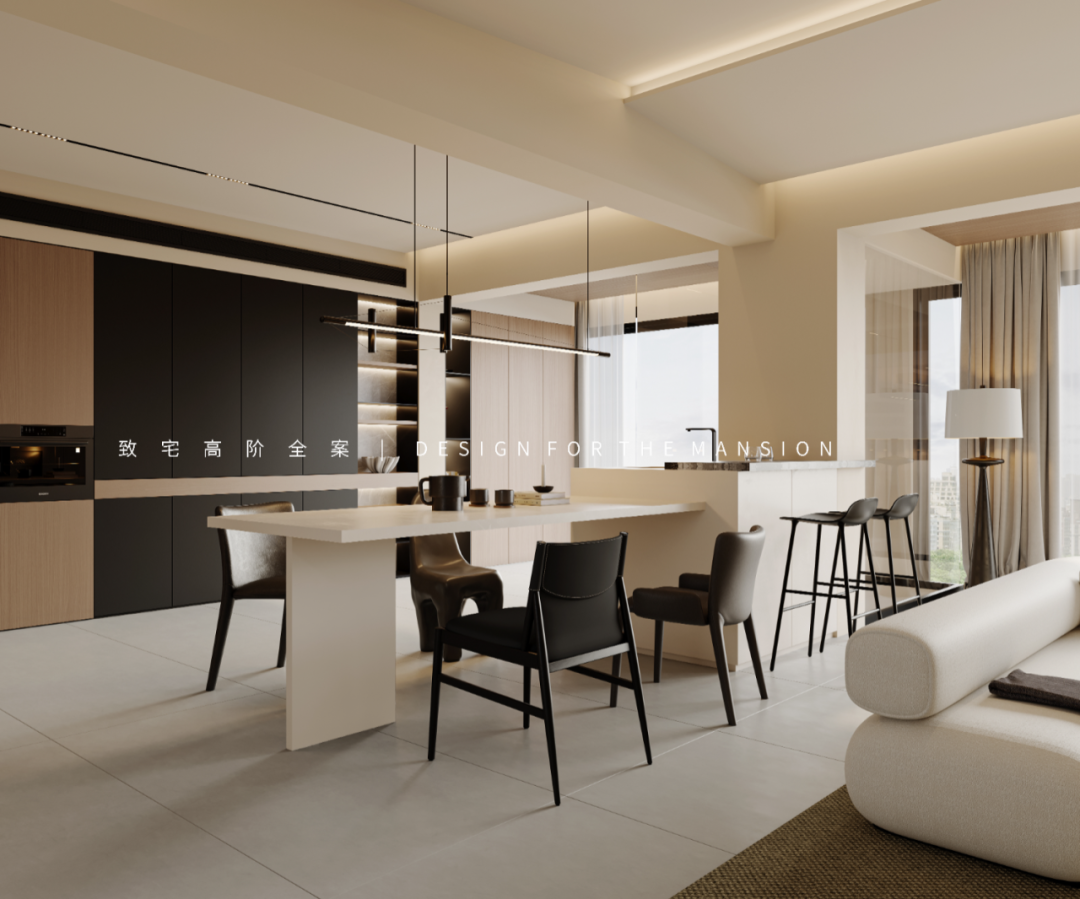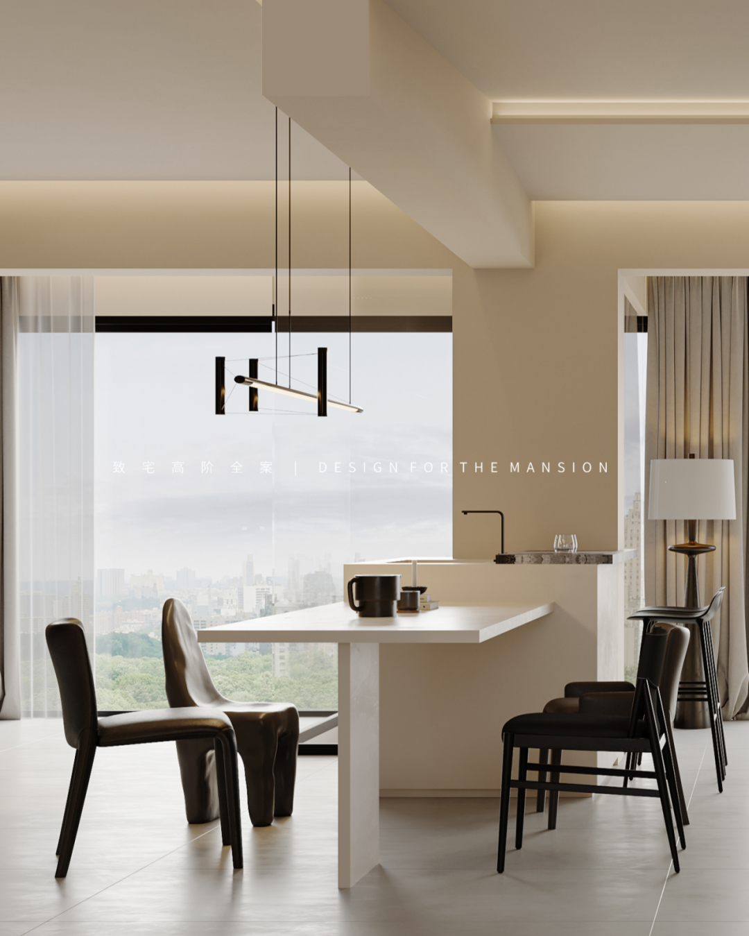 全定制餐岛可以做到同质同材同色,桌腿也使用同材质,以尽极简之能。