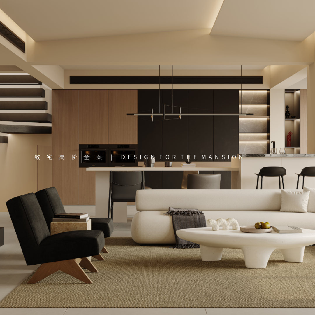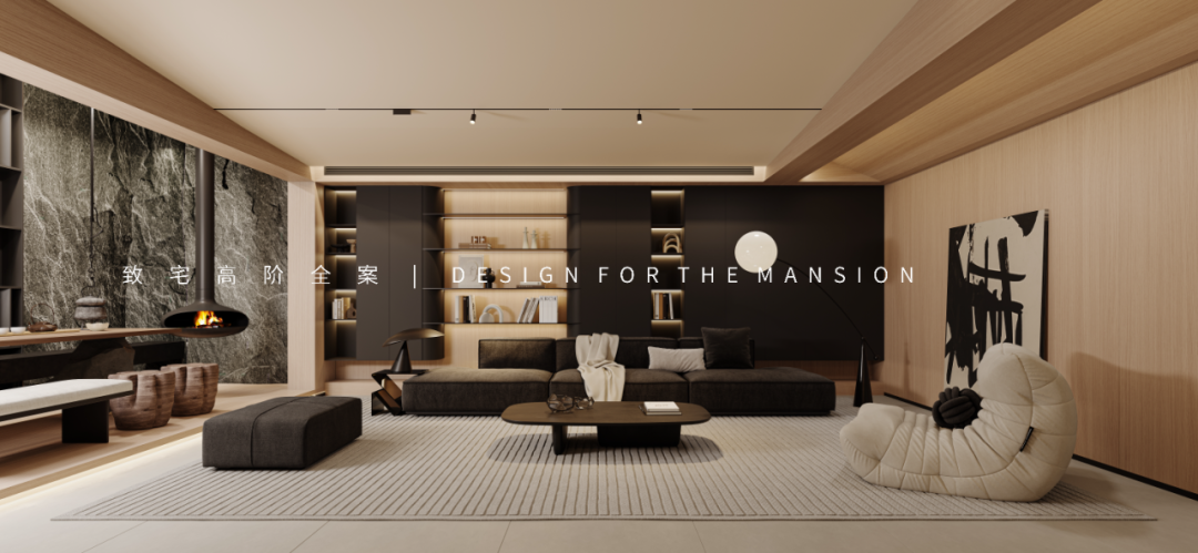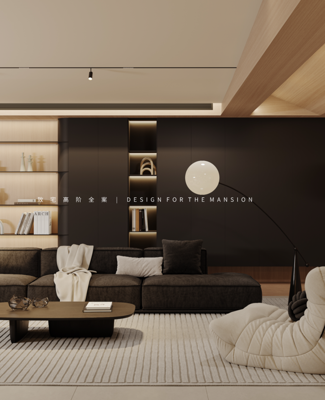低靠背白色沙发与白色茶几提亮趋向统一的底色,黑色单人椅带来视觉重点与色块上的平衡。